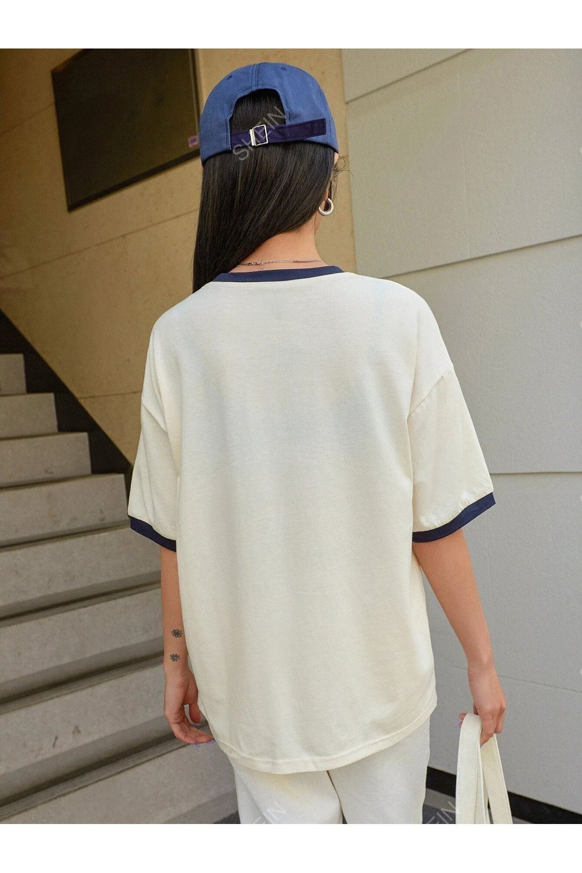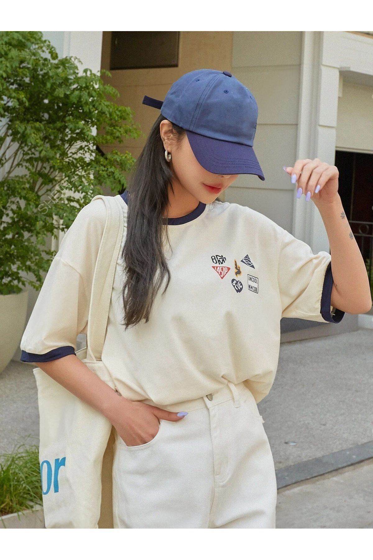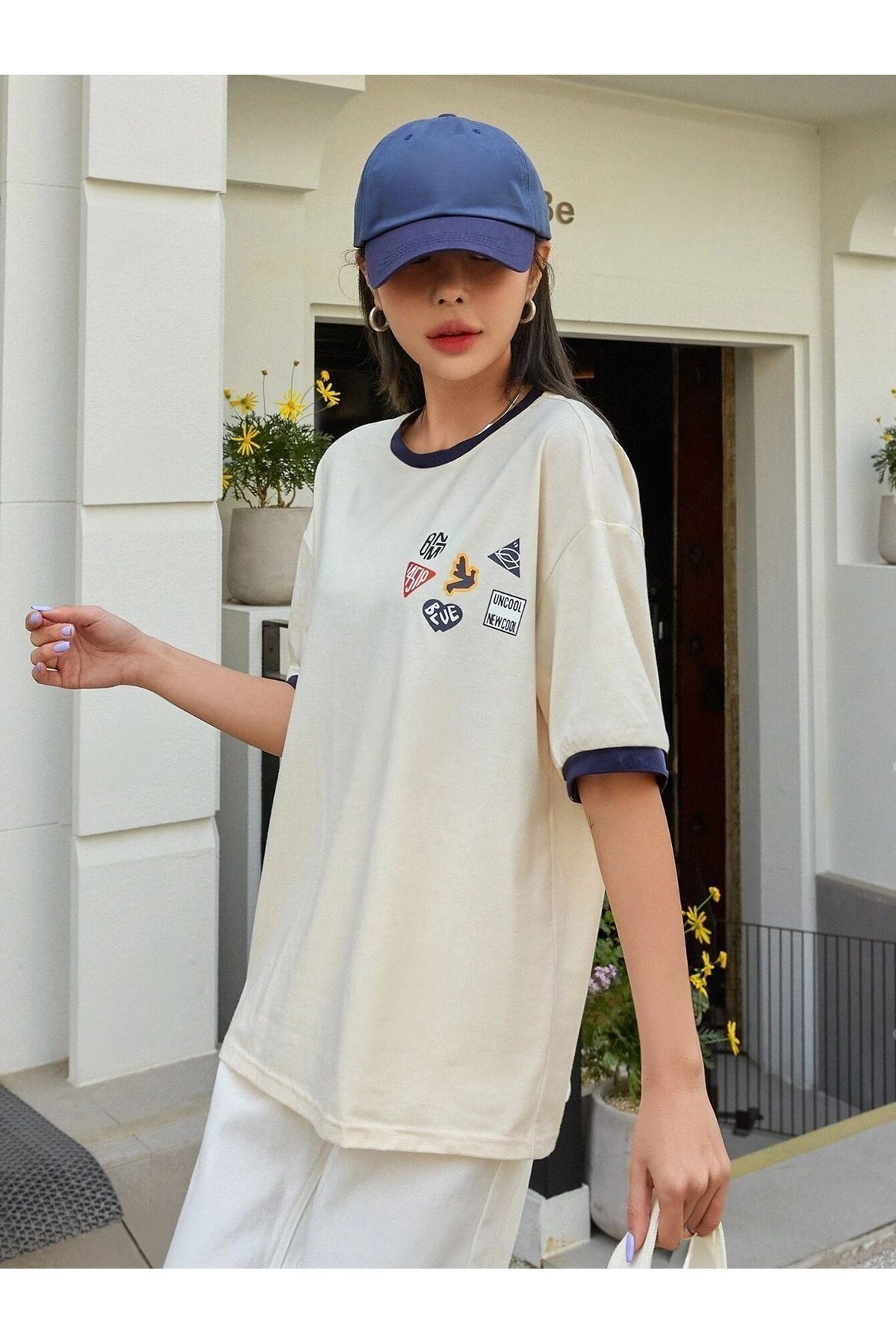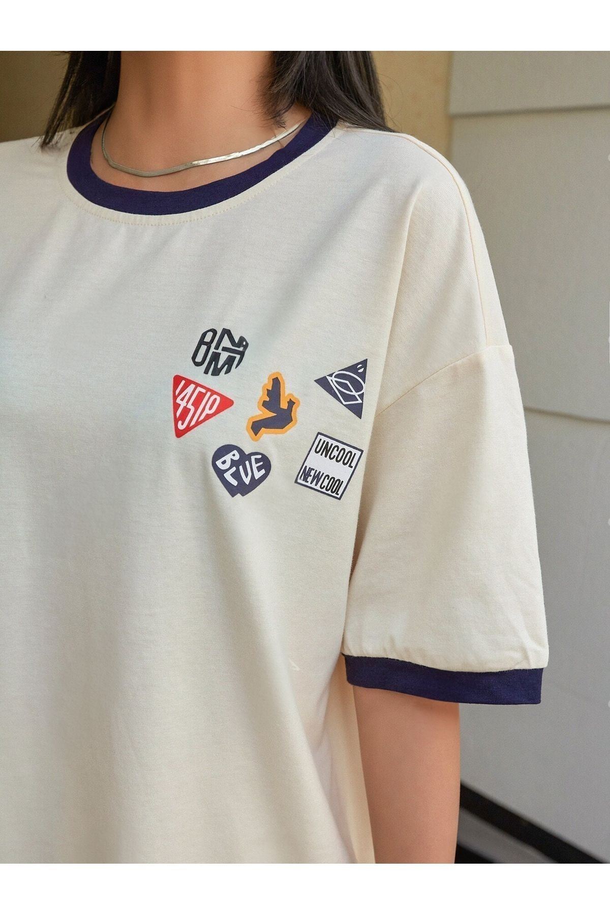 Uncool Bej Gövde Lacivert Biyeli T-shirt - Oversize Bisiklet Yaka Kısa Kol Tişört