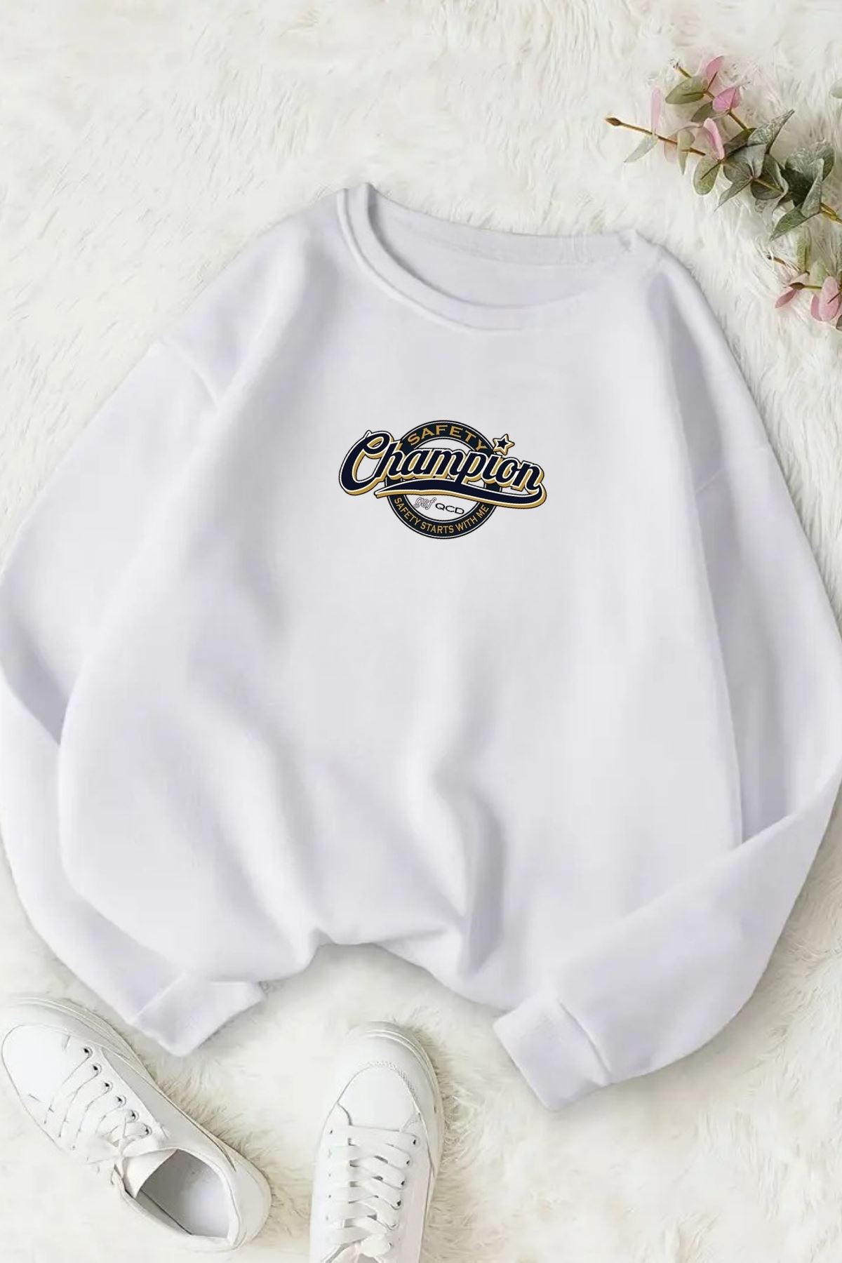 Unisex Beyaz CHAMPİON Baskılı Bisiklet Yaka Sweatshirt- Kışlık Şardonlu Kumaş