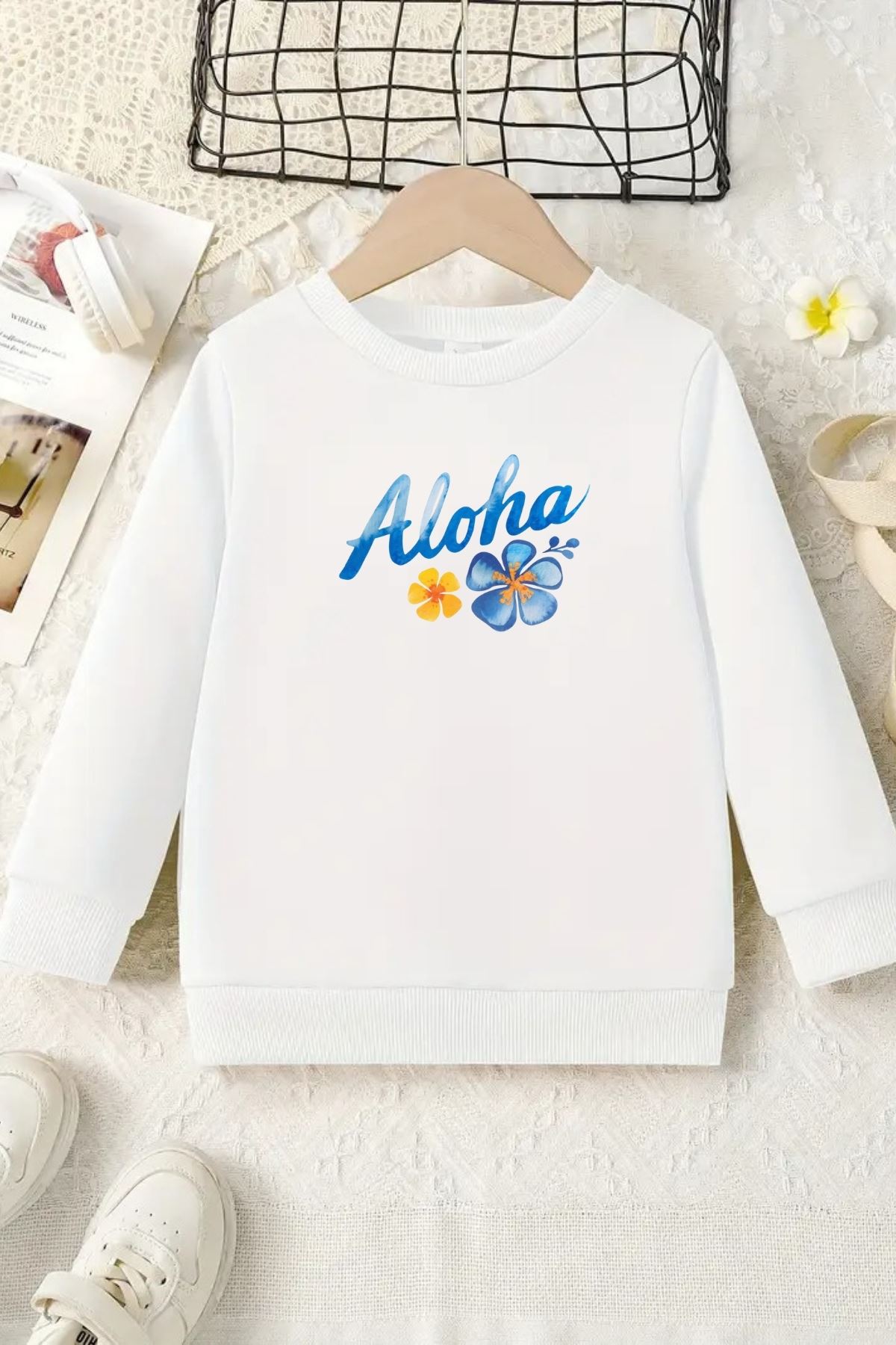Unisex Beyaz Cocuk Bisiklet Yaka Sweatshirt –Aloha,Baskılı Şardonlu Kalın Kumaş