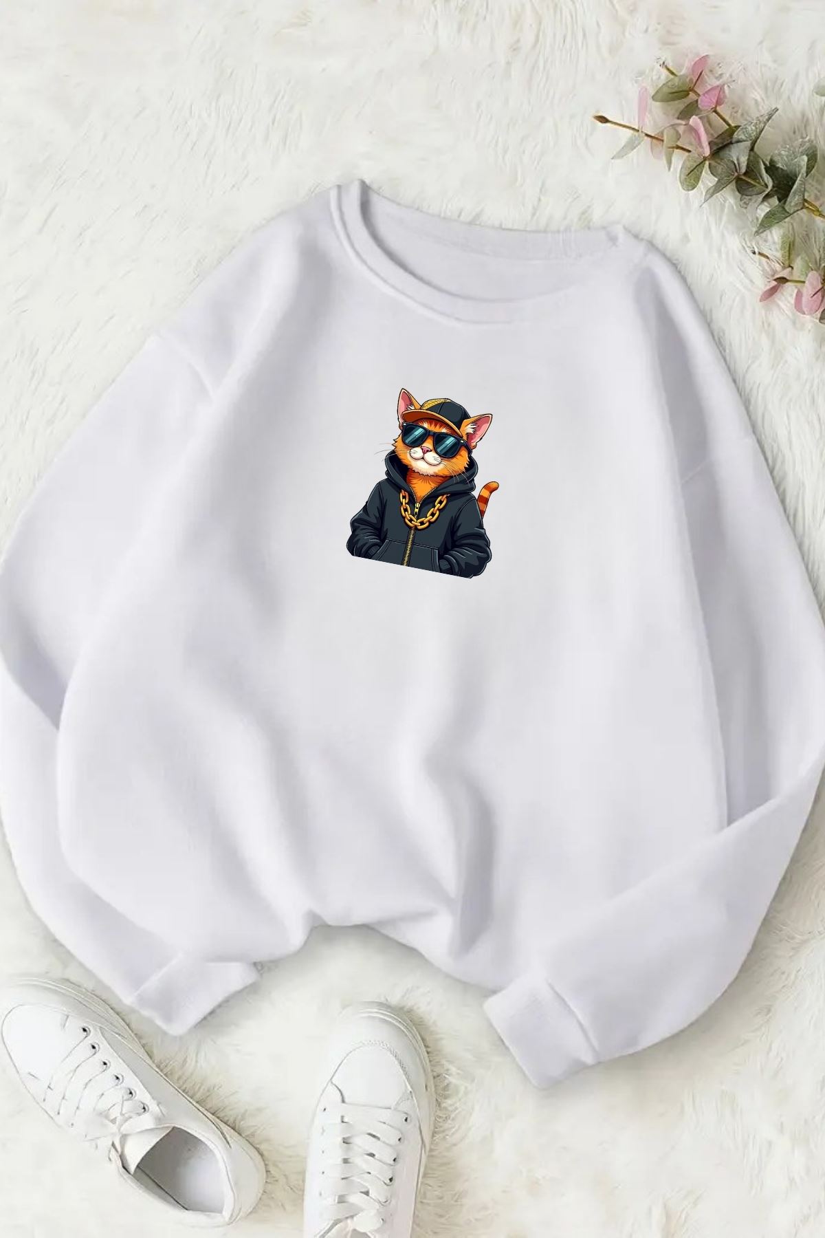 Unisex Beyaz COOL CAT Baskılı Bisiklet Yaka Sweatshirt- Kışlık Şardonlu Kumaş