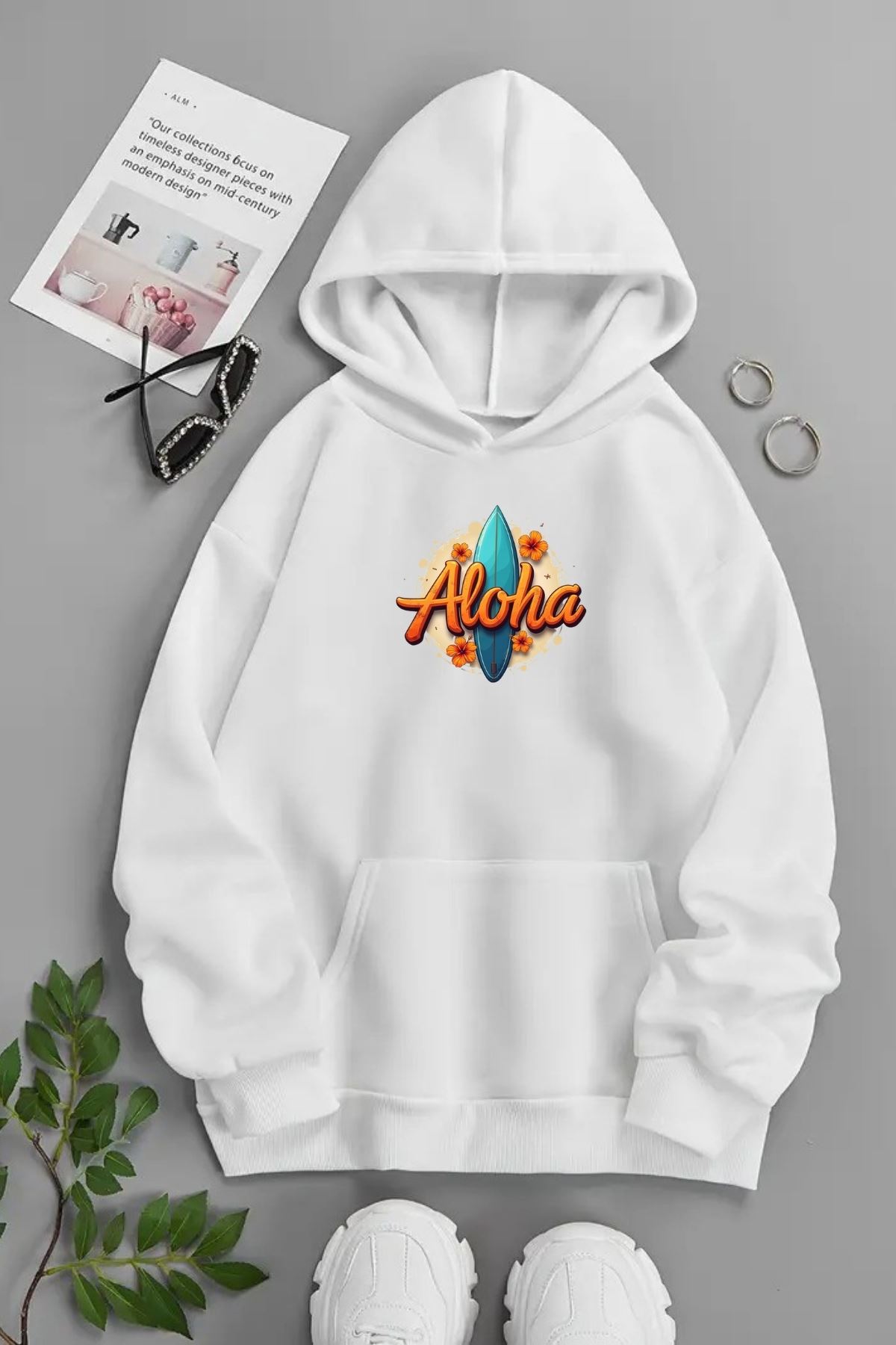 Unisex Beyaz Kapüşonlu Sweatshirt – Aloha ,Baskılı Şardonlu Kalın Kumaş