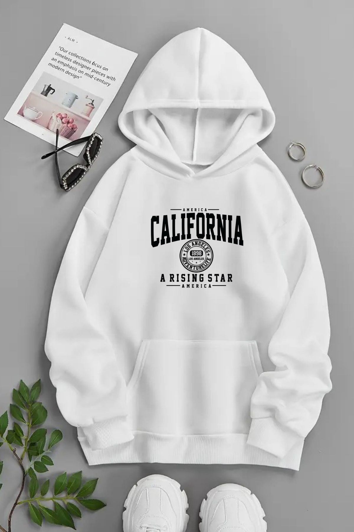 Unisex Beyaz Kapüşonlu Sweatshirt – California Rising Star ,Baskılı Şardonlu Kalın Kumaş