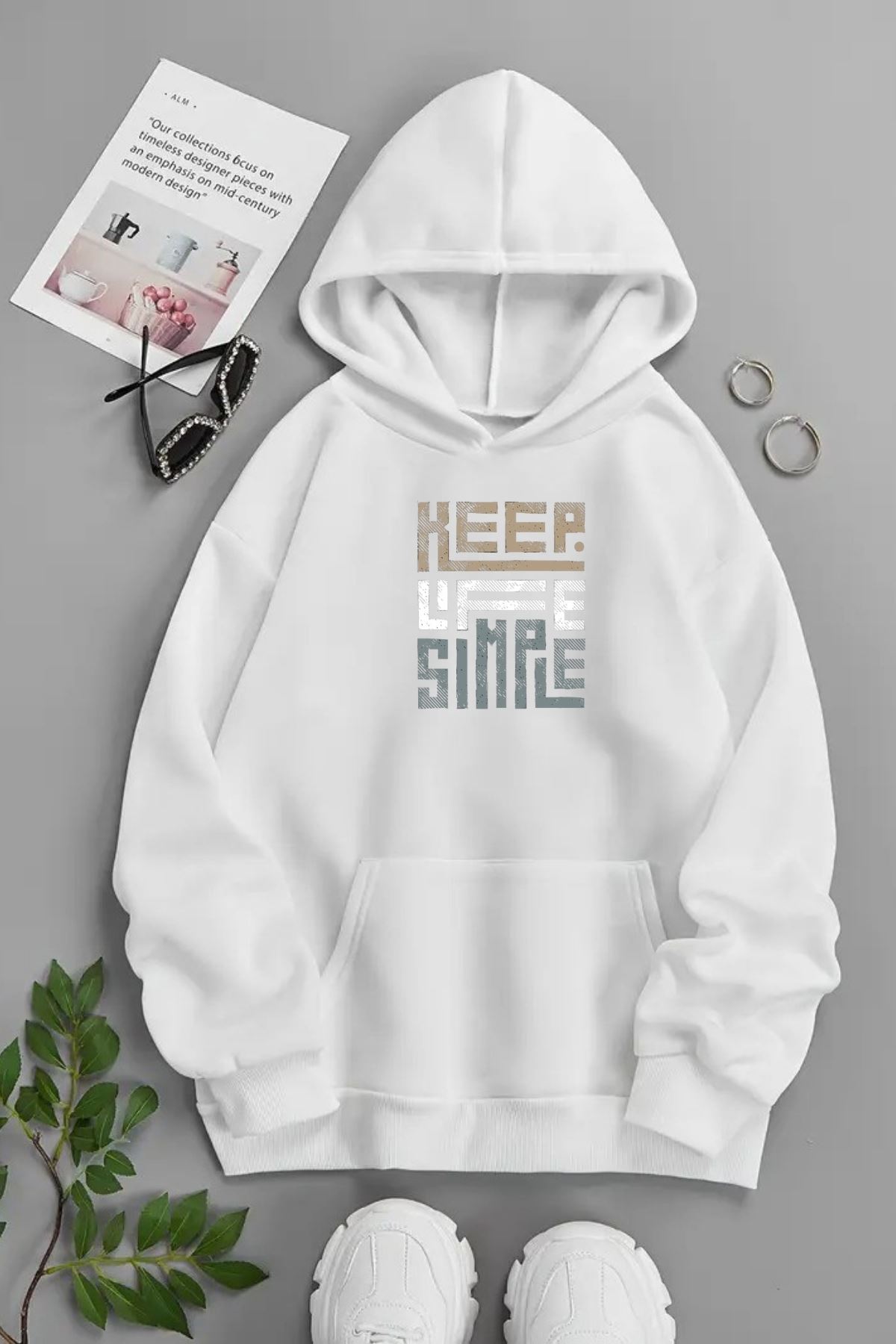 Unisex Beyaz Kapüşonlu Sweatshirt – Keep Life Smile ,Baskılı Şardonlu Kalın Kumaş
