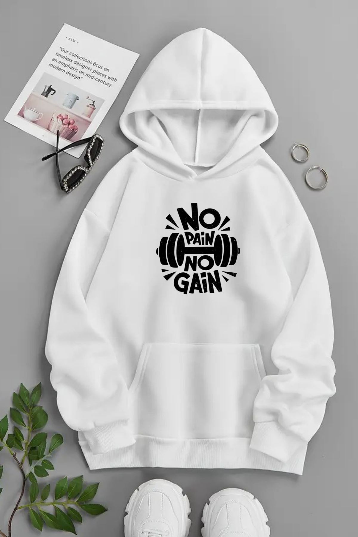 Unisex Beyaz Kapüşonlu Sweatshirt – NO PAİN NO GAİN ,Baskılı Şardonlu Kalın Kumaş
