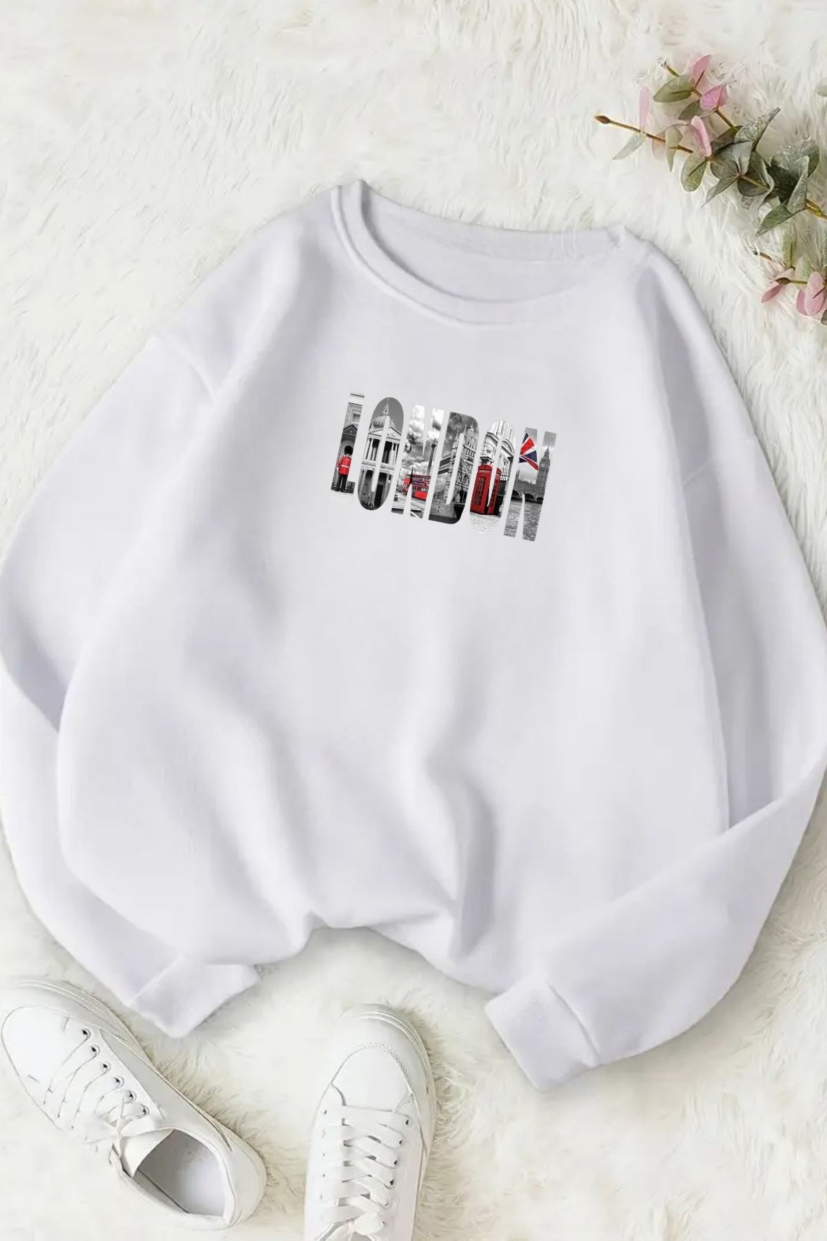 Unisex Beyaz LONDON Baskılı Bisiklet Yaka Sweatshirt- Kışlık Şardonlu Kumaş