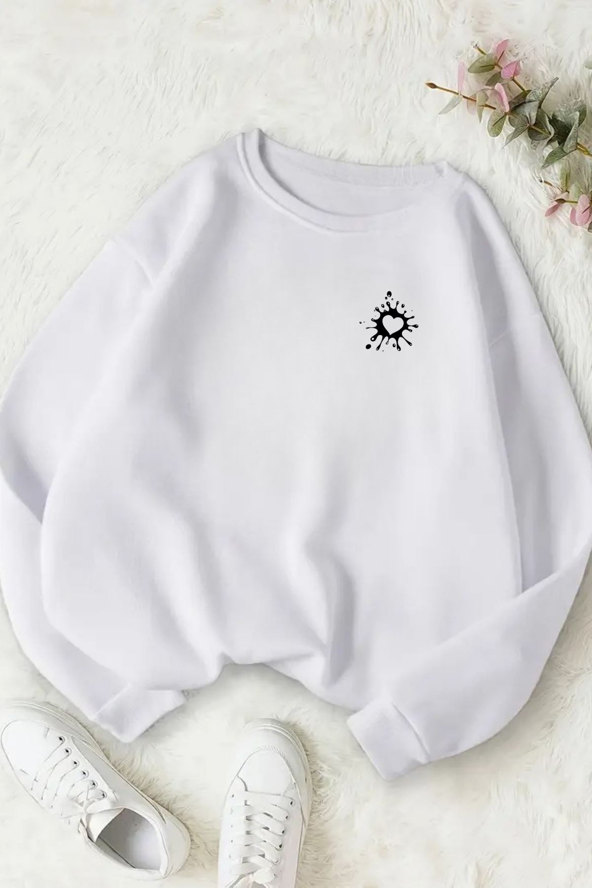 Unisex Beyaz MİNİ DAMLA KALP Baskılı Bisiklet Yaka Sweatshirt- Kışlık Şardonlu Kumaş