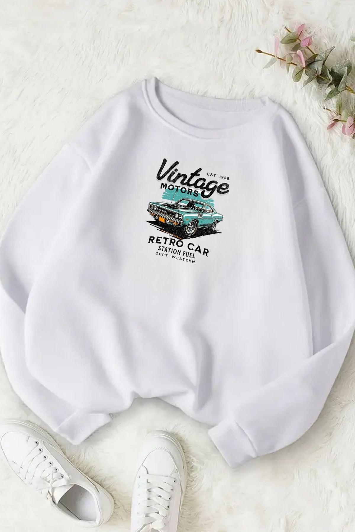 Unisex Beyaz VİNTAGE CAR Baskılı Bisiklet Yaka Sweatshirt- Kışlık Şardonlu Kumaş