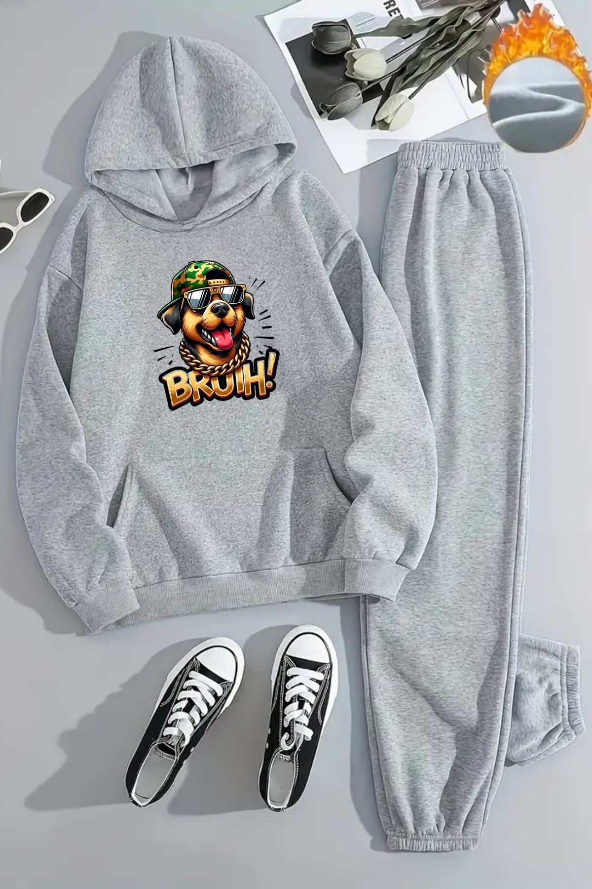 Unisex BRUH DOG Baskılı Kapüşonlu Gri Eşofman Takımı - Kışlık Şardonlu Kumaş