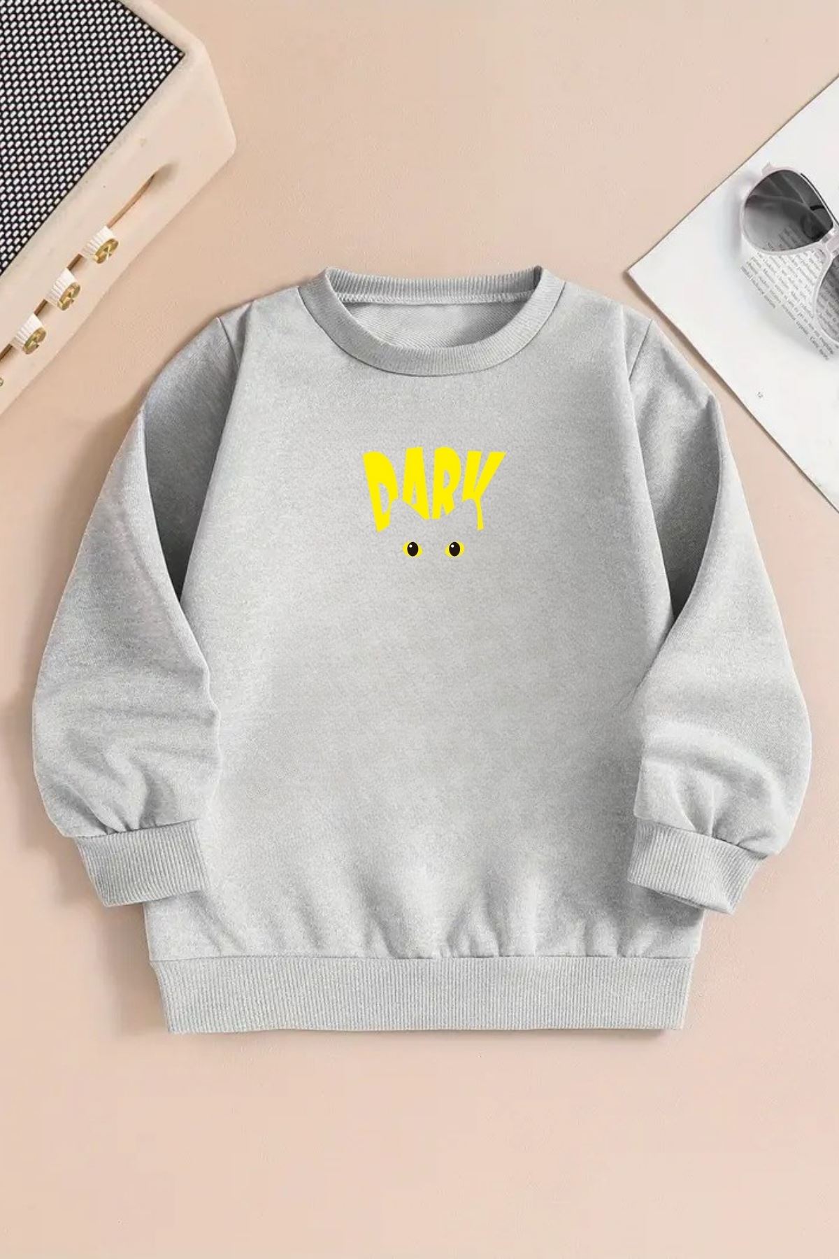 Unisex DARK Baskılı Gri Bisiklet Yaka Sweatshirt-Kışlık Şardonlu Kumaş