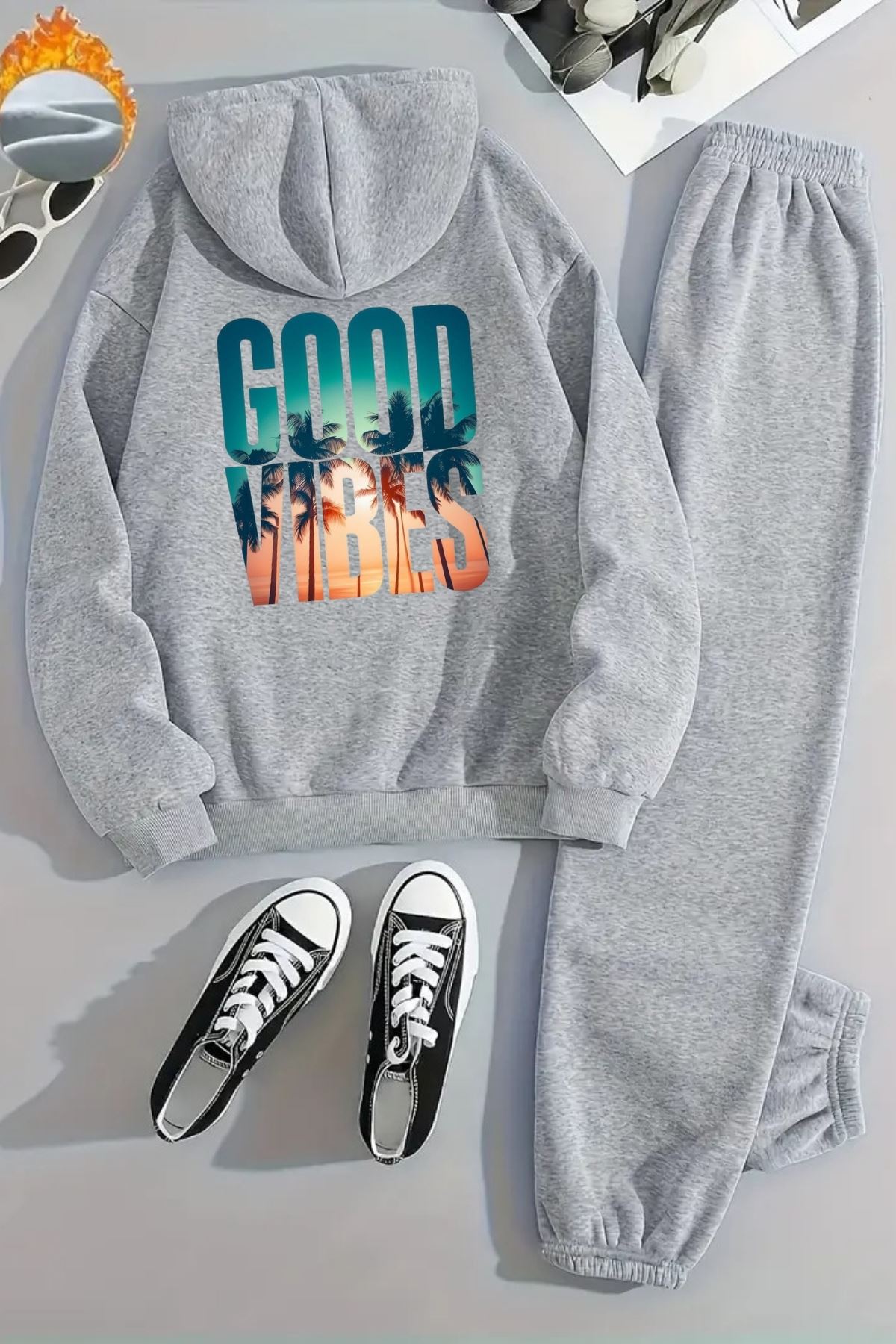 Unisex GOOD VBS ARKA Baskılı Kapüşonlu Gri Eşofman Takımı - Kışlık Şardonlu Kumaş