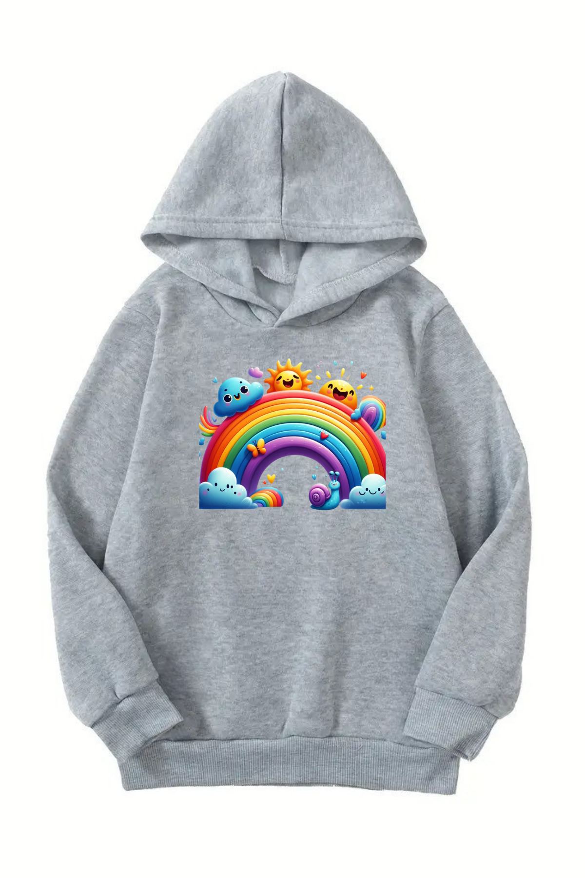 Unisex Gri Cocuk Kapüşonlu Sweatshirt –Gokkusagı Baskılı, Şardonlu Kalın Kumaş