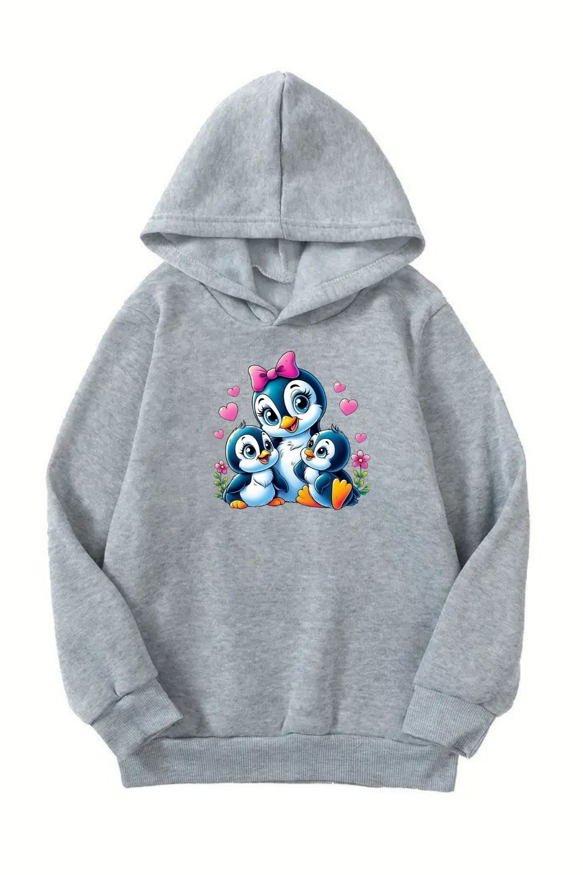 Unisex Gri Cocuk Kapüşonlu Sweatshirt –Penguenler Baskılı, Şardonlu Kalın Kumaş