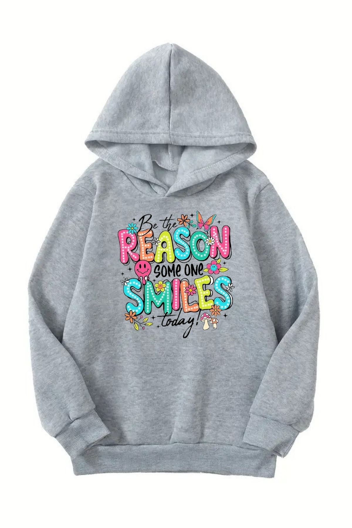 Unisex Gri Cocuk Kapüşonlu Sweatshirt –Reason Smile Baskılı, Şardonlu Kalın Kumaş