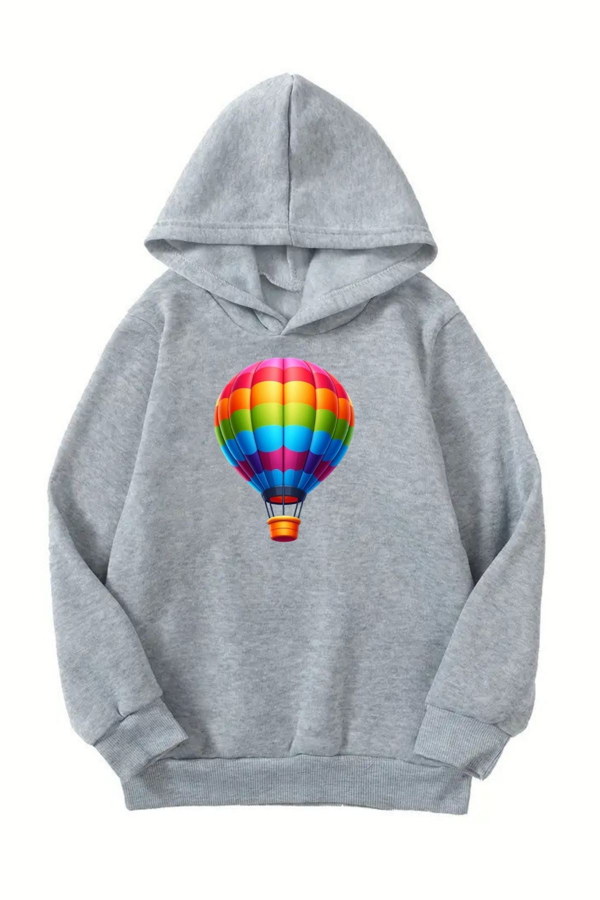 Unisex Gri Cocuk Kapüşonlu Sweatshirt –Ucan Balon Baskılı, Şardonlu Kalın Kumaş