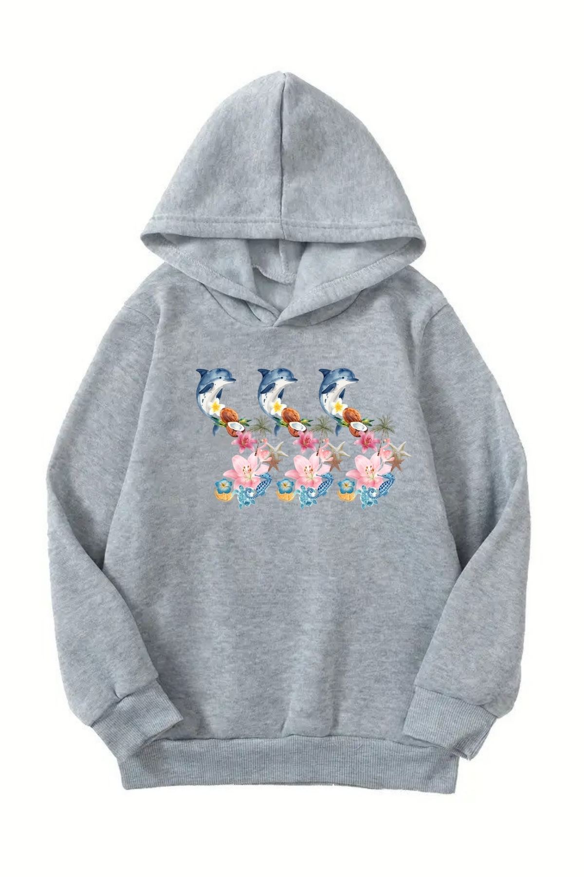 Unisex Gri Cocuk Kapüşonlu Sweatshirt –Üçlü Yunus Baskılı, Şardonlu Kalın Kumaş