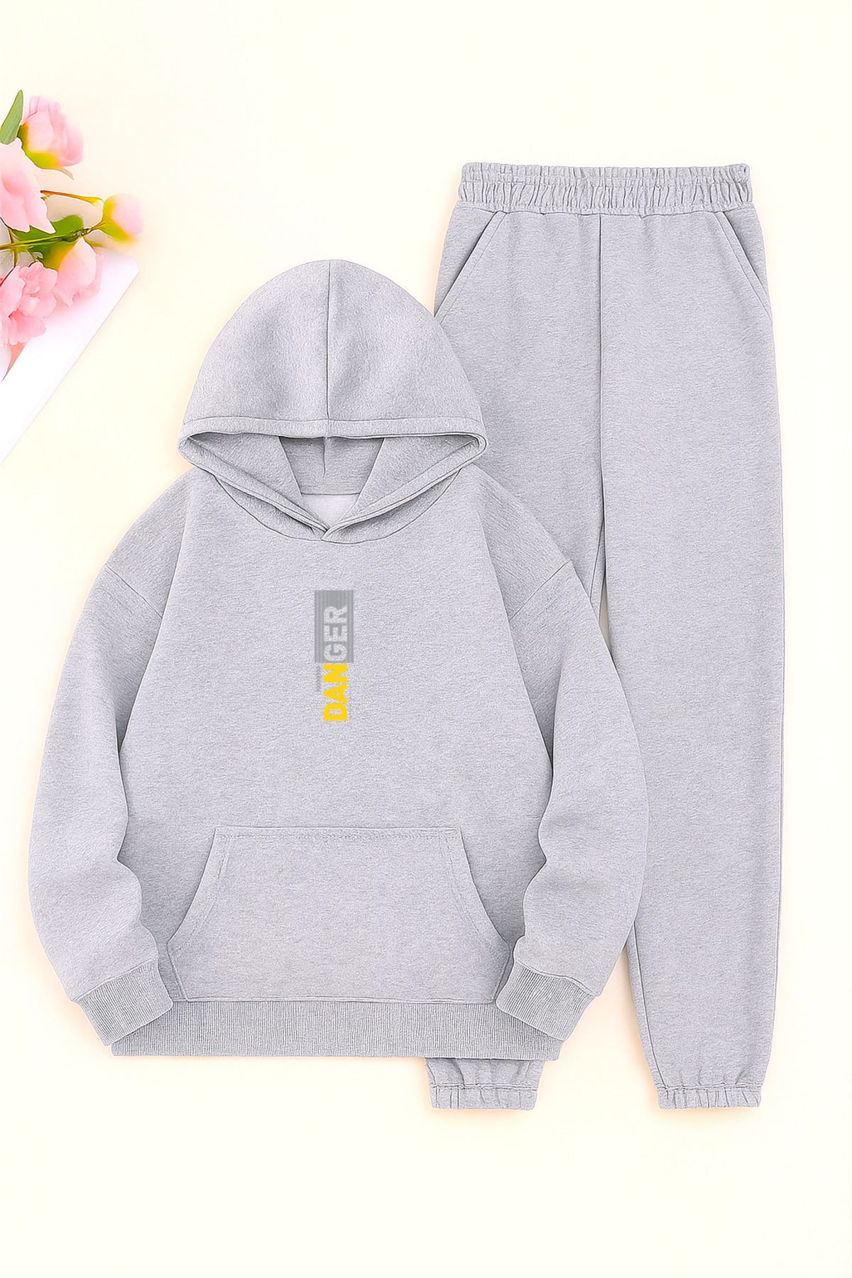 Unisex Gri Danger Baskılı Eşofman Kapüşon- Kışlık Şardonlu Kumaş