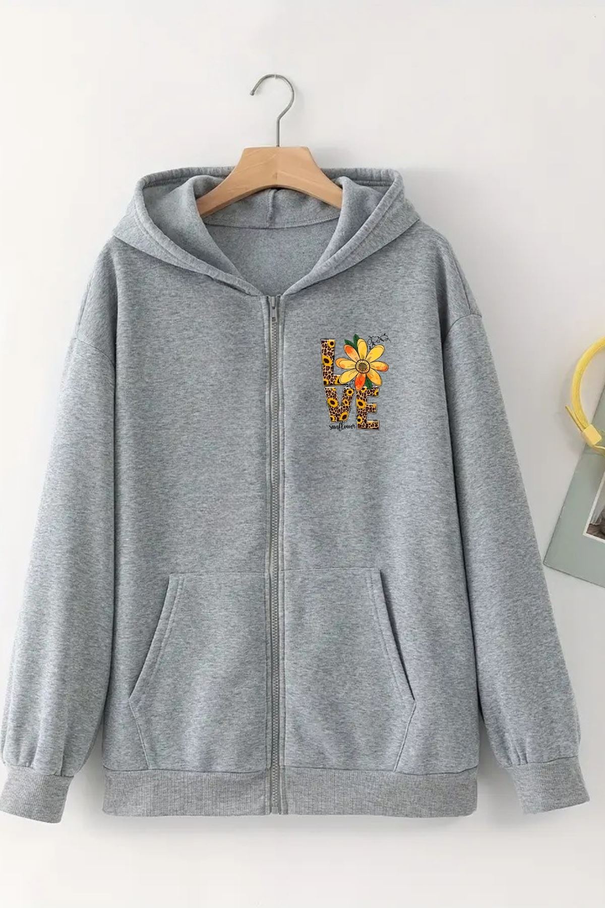Unisex Gri Kapüşonlu Fermuarlı HIRKA – LOVE ÇİÇEK Baskılı, Şardonlu Kalın Kumaş
