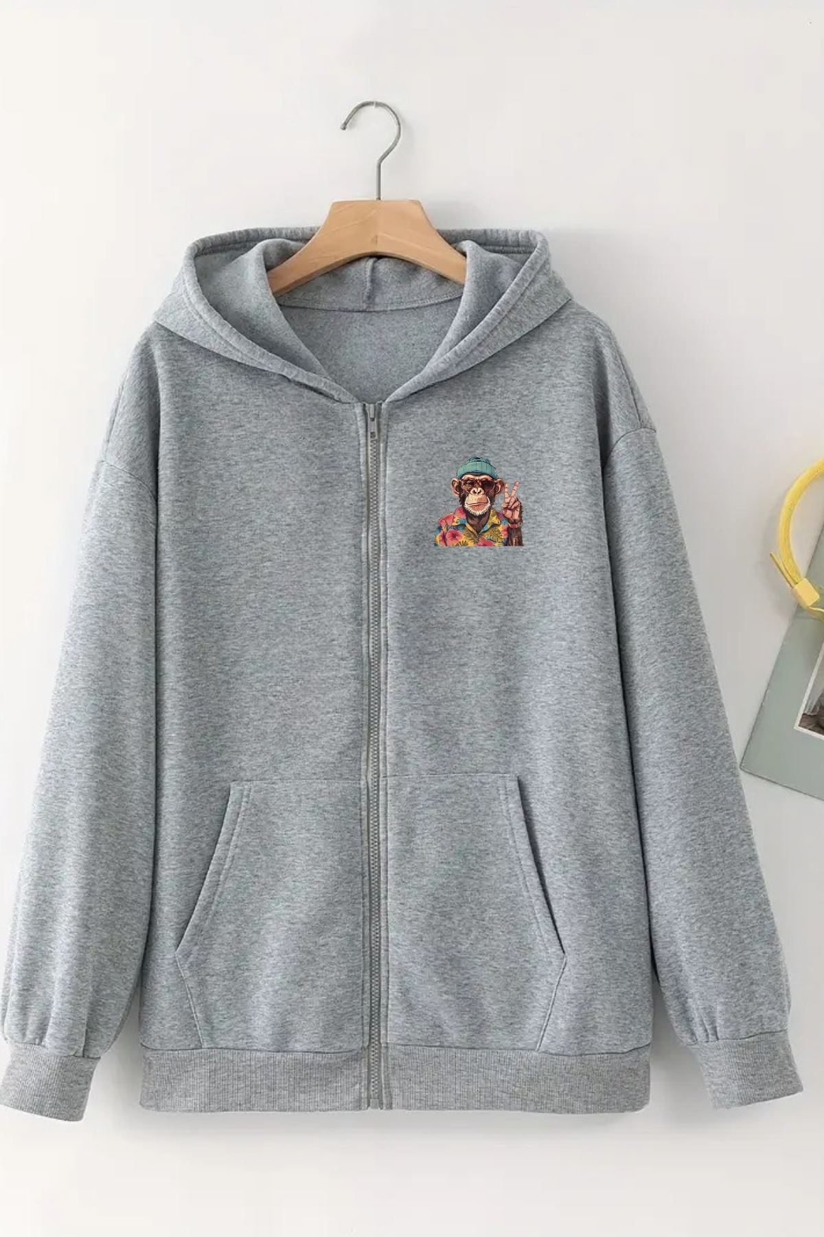 Unisex Gri Kapüşonlu Fermuarlı HIRKA – MAYMUN Baskılı, Şardonlu Kalın Kumaş
