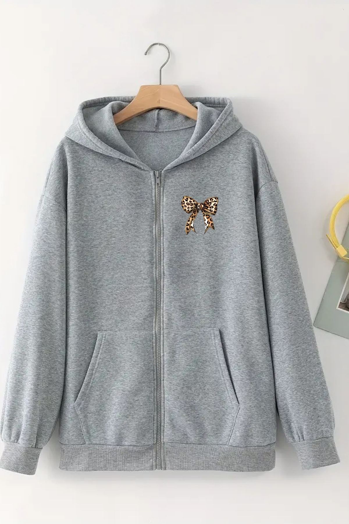Unisex Gri Kapüşonlu Fermuarlı HIRKA – MİNİMAL LEOPAR KURDELA Baskılı, Şardonlu Kalın Kumaş