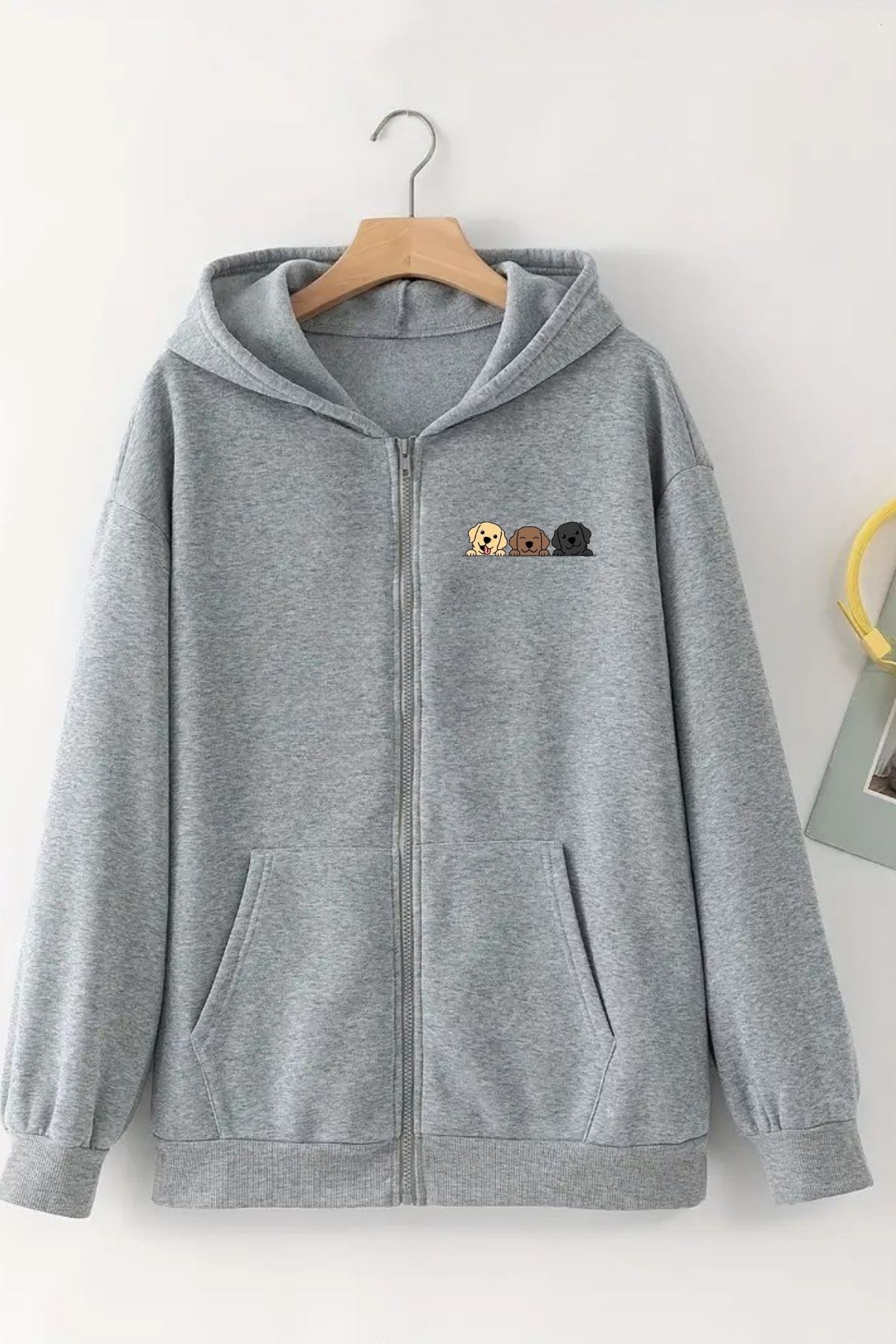 Unisex Gri Kapüşonlu Fermuarlı HIRKA – SEVİMLİ KÖPEKLER Baskılı, Şardonlu Kalın Kumaş