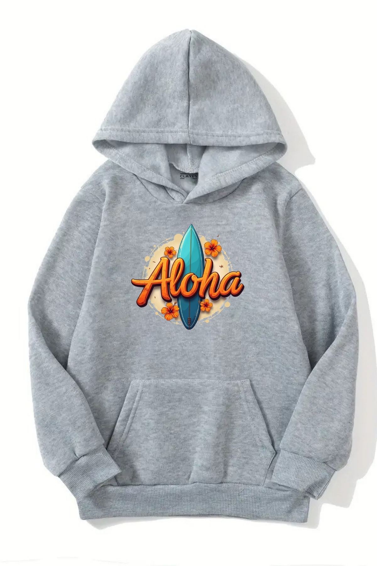 Unisex Gri Kapüşonlu Sweatshirt – Aloha Baskılı,Şardonlu Kalın Kumaş
