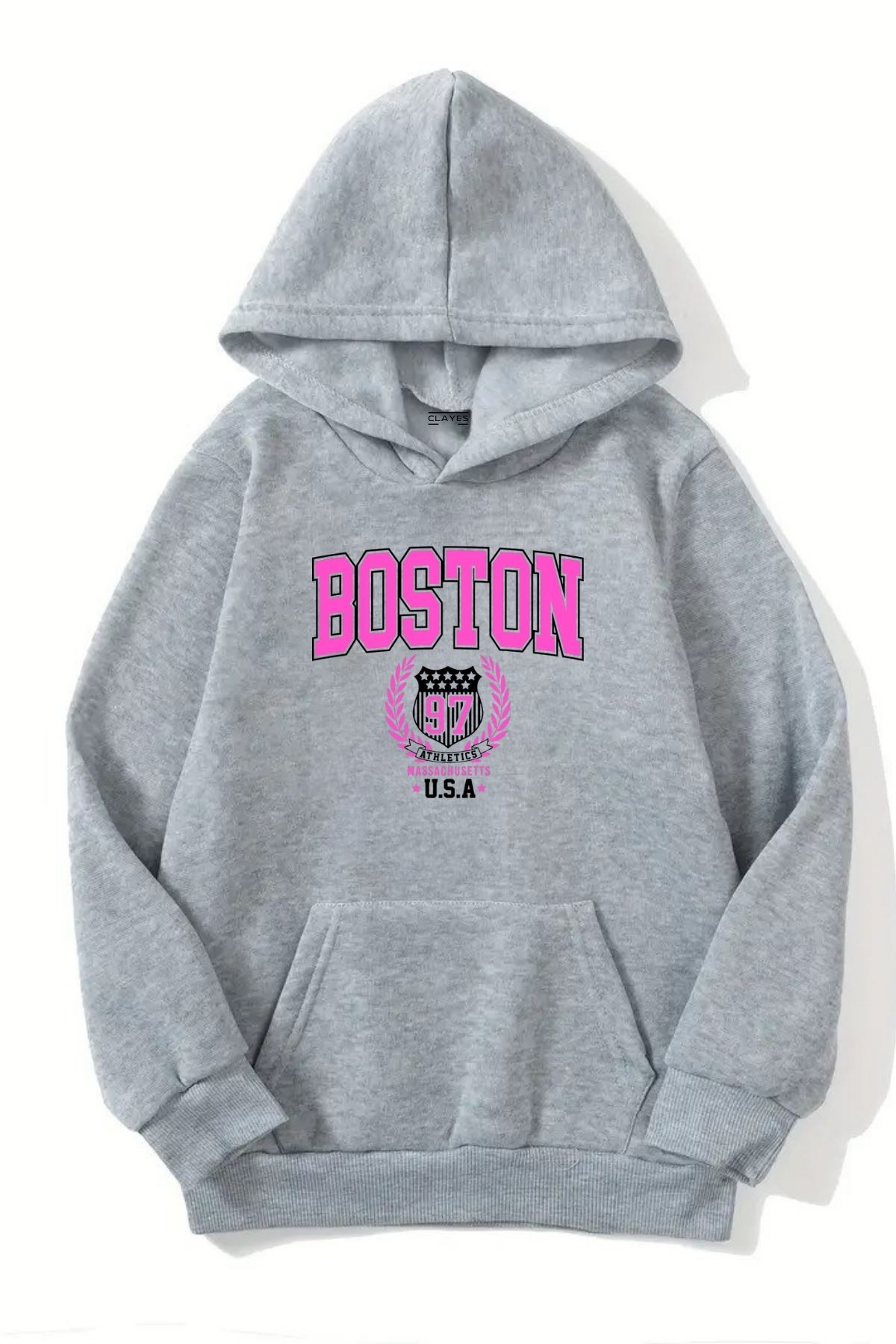 Unisex Gri Kapüşonlu Sweatshirt – Boston Usa Baskılı, Şardonlu Kalın Kumaş