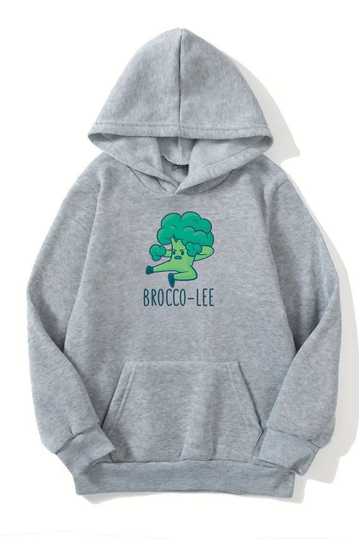 Unisex Gri Kapüşonlu Sweatshirt – Brocco Lee Baskılı, Şardonlu Kalın Kumaş