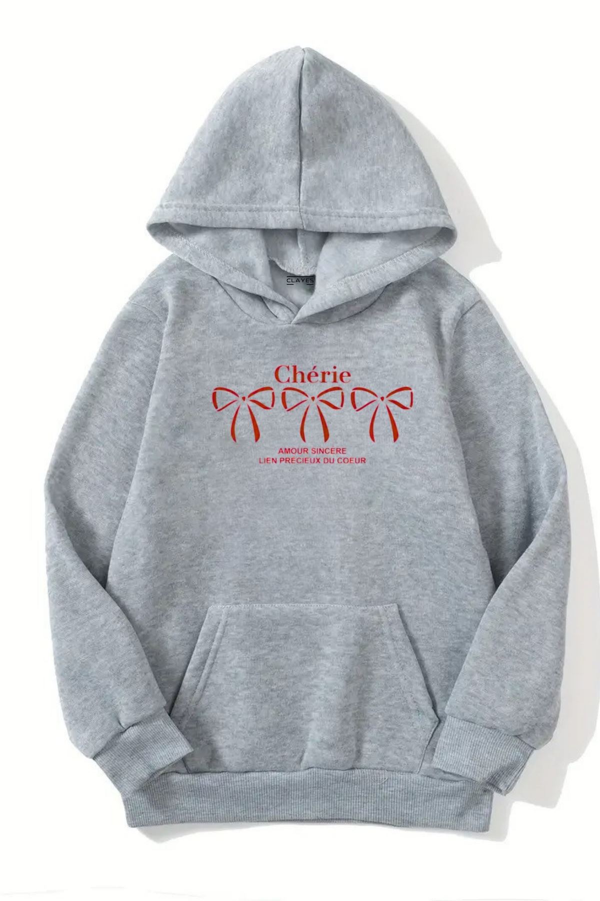 Unisex Gri Kapüşonlu Sweatshirt – Cherie Kurdela Baskılı, Şardonlu Kalın Kumaş