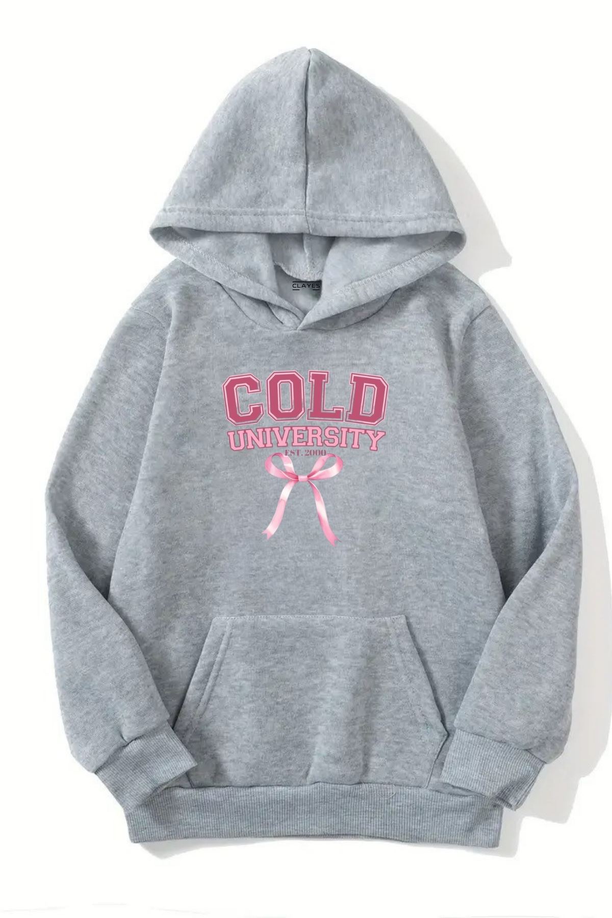 Unisex Gri Kapüşonlu Sweatshirt – Cold University Baskılı,Şardonlu Kalın Kumaş