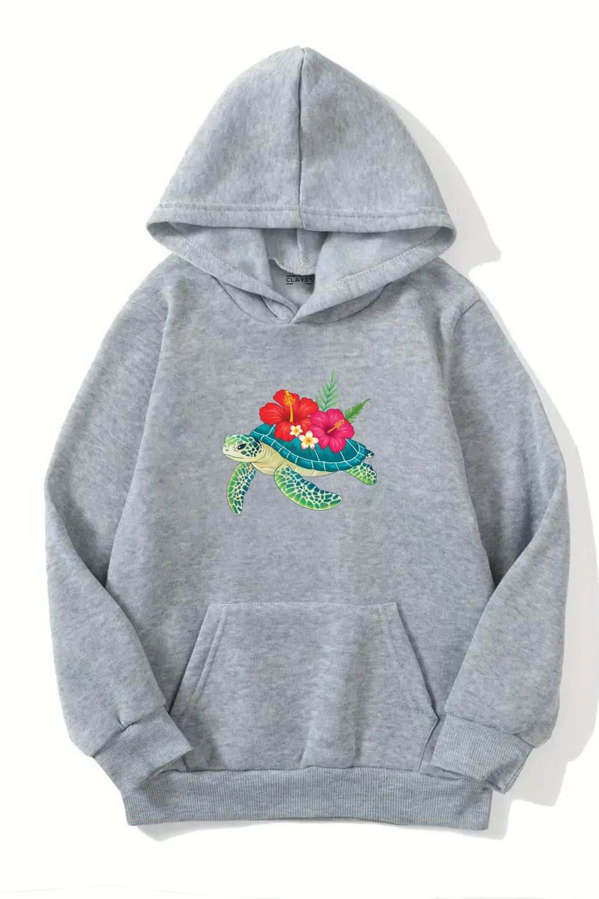 Unisex Gri Kapüşonlu Sweatshirt – Kaplumbağa Baskılı, Şardonlu Kalın Kumaş