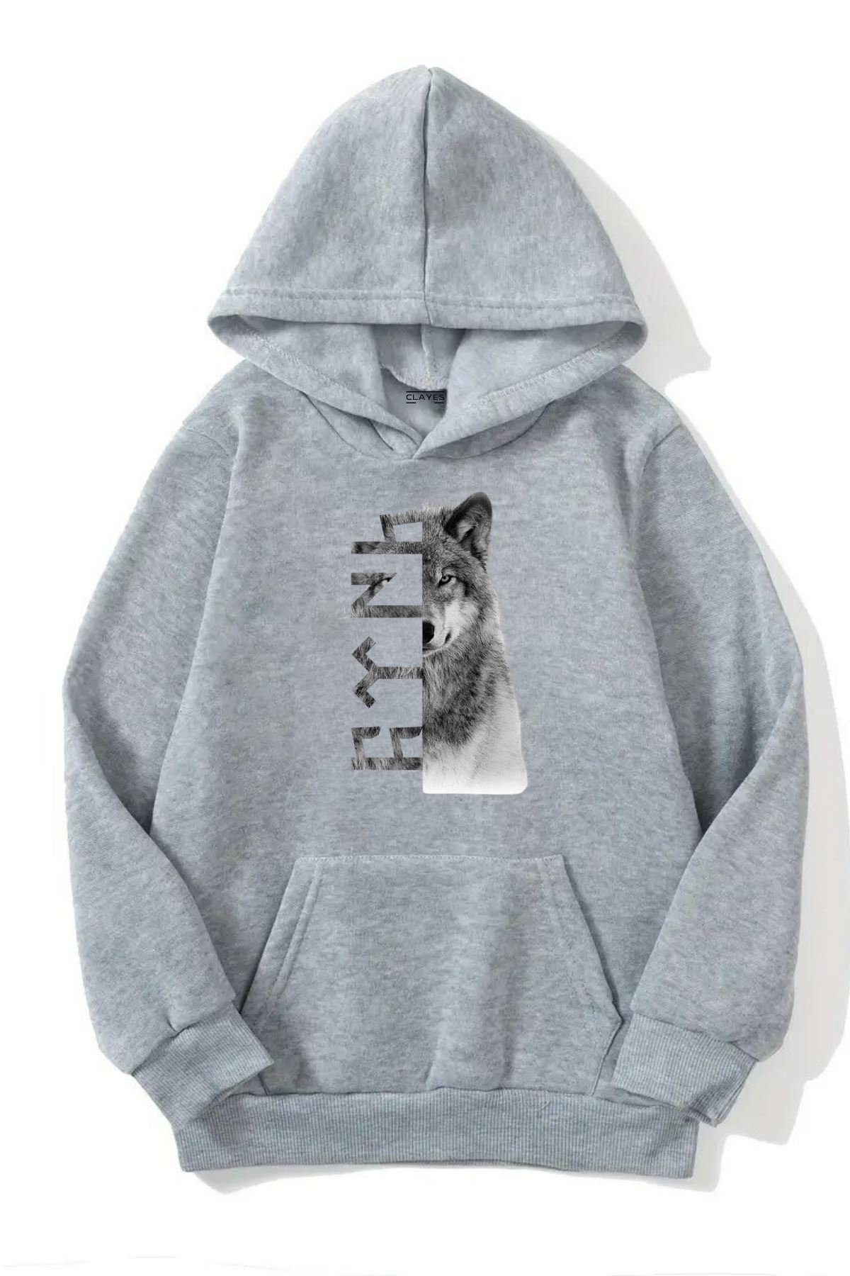 Unisex Gri Kapüşonlu Sweatshirt – Kurt Desenli Baskılı, Şardonlu Kalın Kumaş
