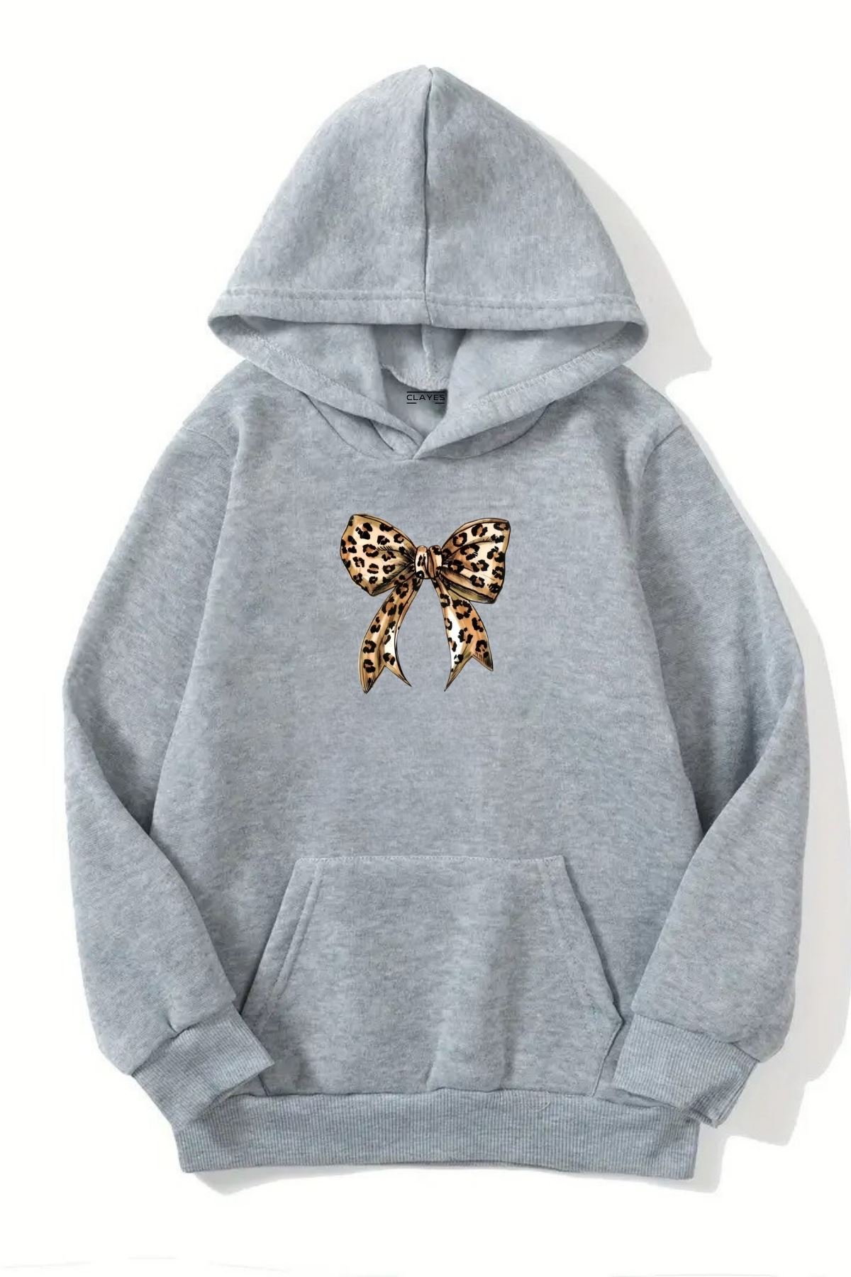 Unisex Gri Kapüşonlu Sweatshirt – Leopar Kurdela Baskılı,Şardonlu Kalın Kumaş