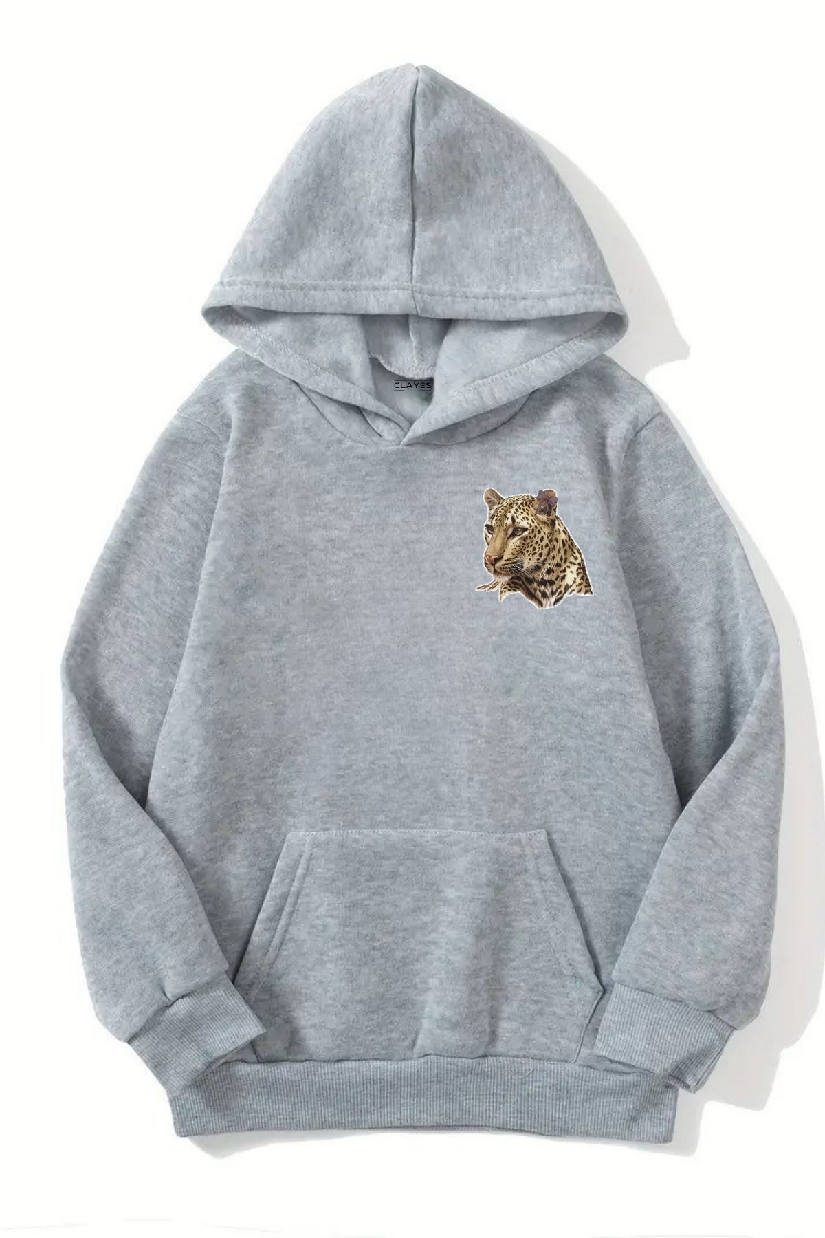 Unisex Gri Kapüşonlu Sweatshirt – Minimal Desenli Leopar,Şardonlu Kalın Kumaş