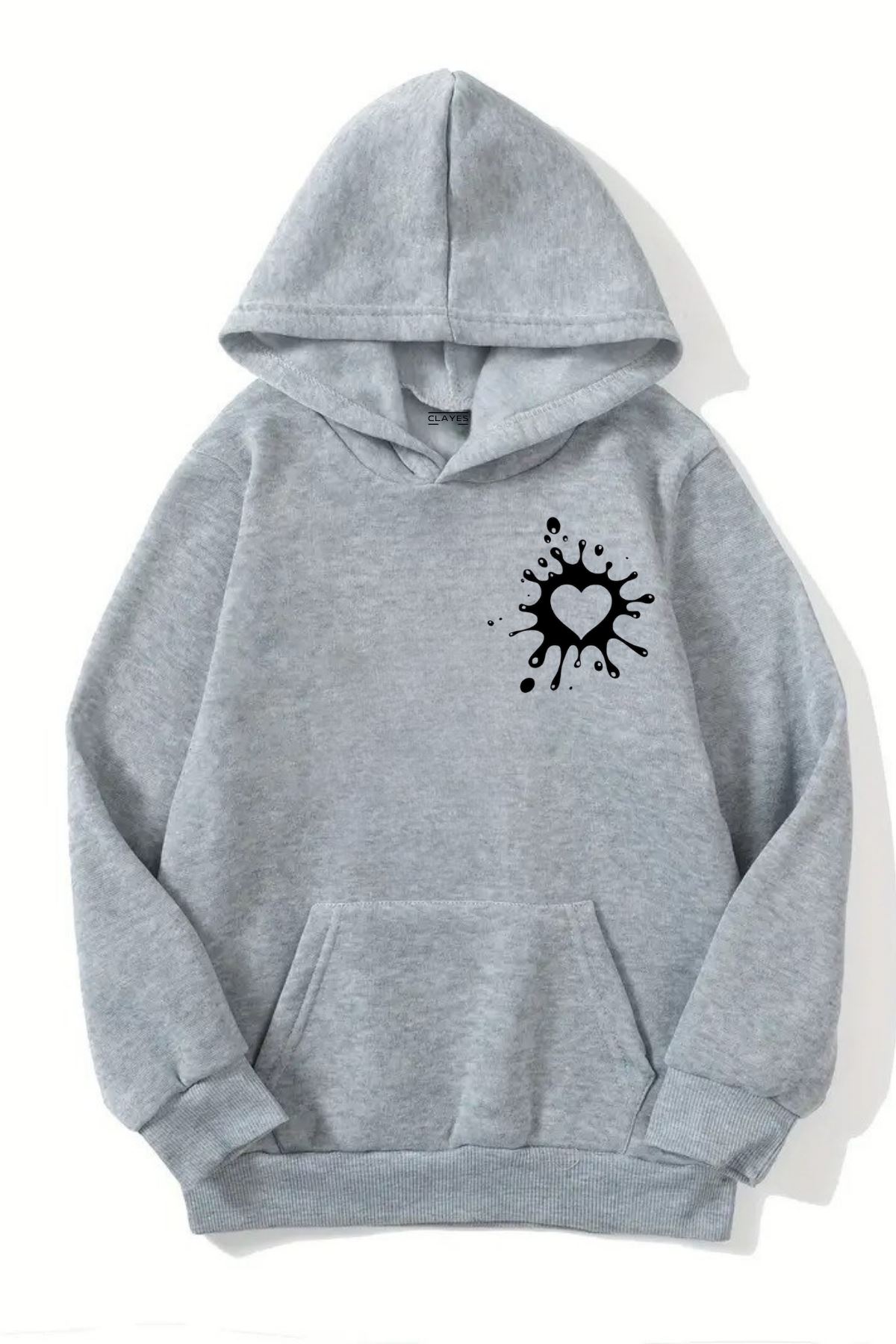 Unisex Gri Kapüşonlu Sweatshirt – Modern Kalp Desenli,Şardonlu Kalın Kumaş