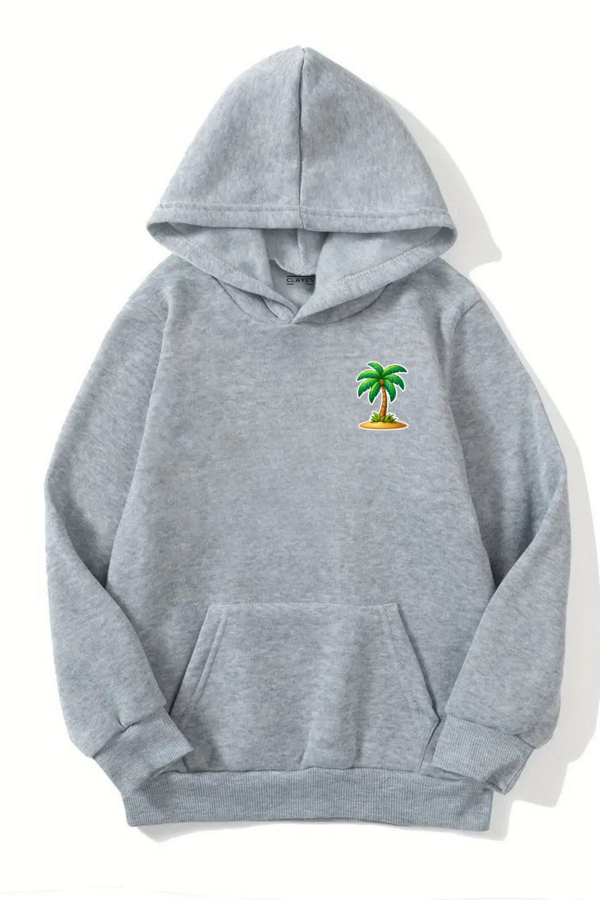 Unisex Gri Kapüşonlu Sweatshirt – Palmiye MinimalBaskılı, Şardonlu Kalın Kumaş