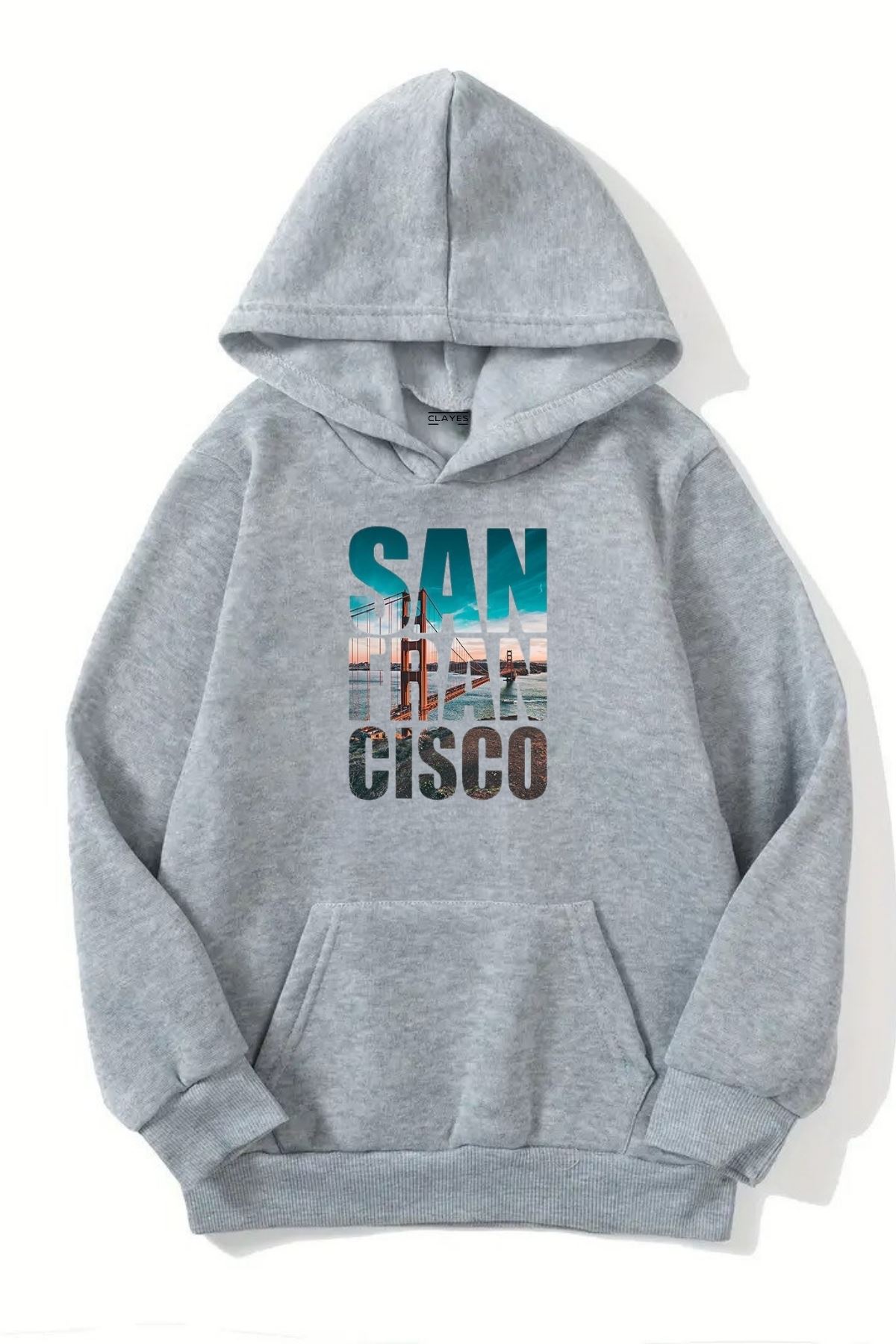 Unisex Gri Kapüşonlu Sweatshirt – San Fran CıscoBaskılı,lŞardonlu Kalın Kumaş