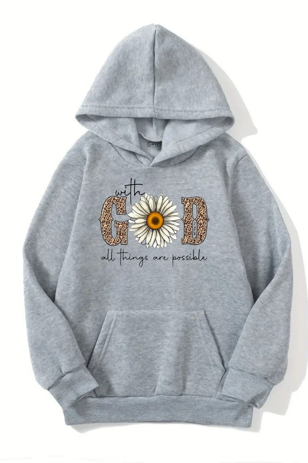Unisex Gri Kapüşonlu Sweatshirt – With God Baskılı, Şardonlu Kalın Kumaş
