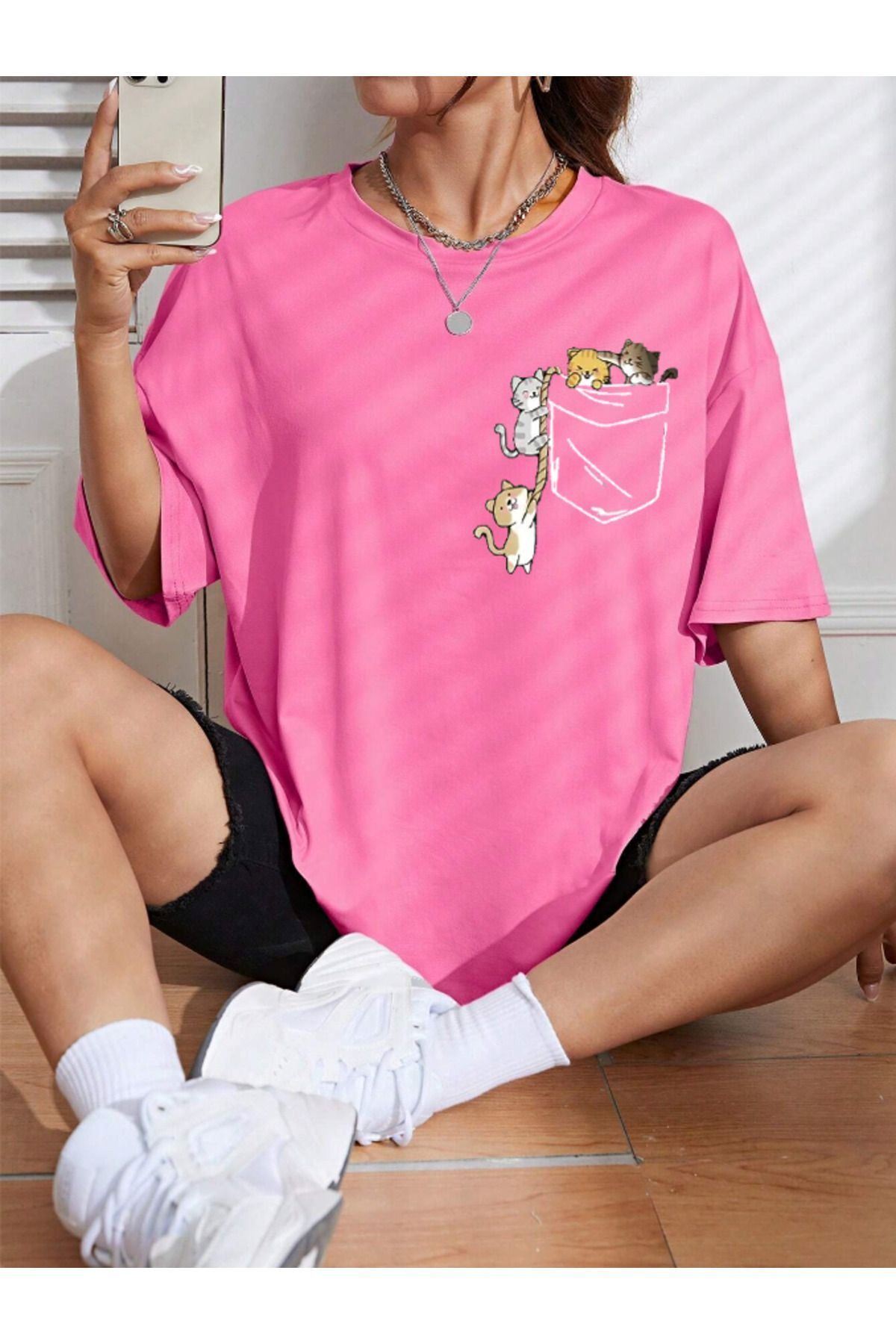 Unisex Kadın/Erkek CAT Renkli Özel Baskılı Oversize Bisiklet Yaka Süprem T-Shirt