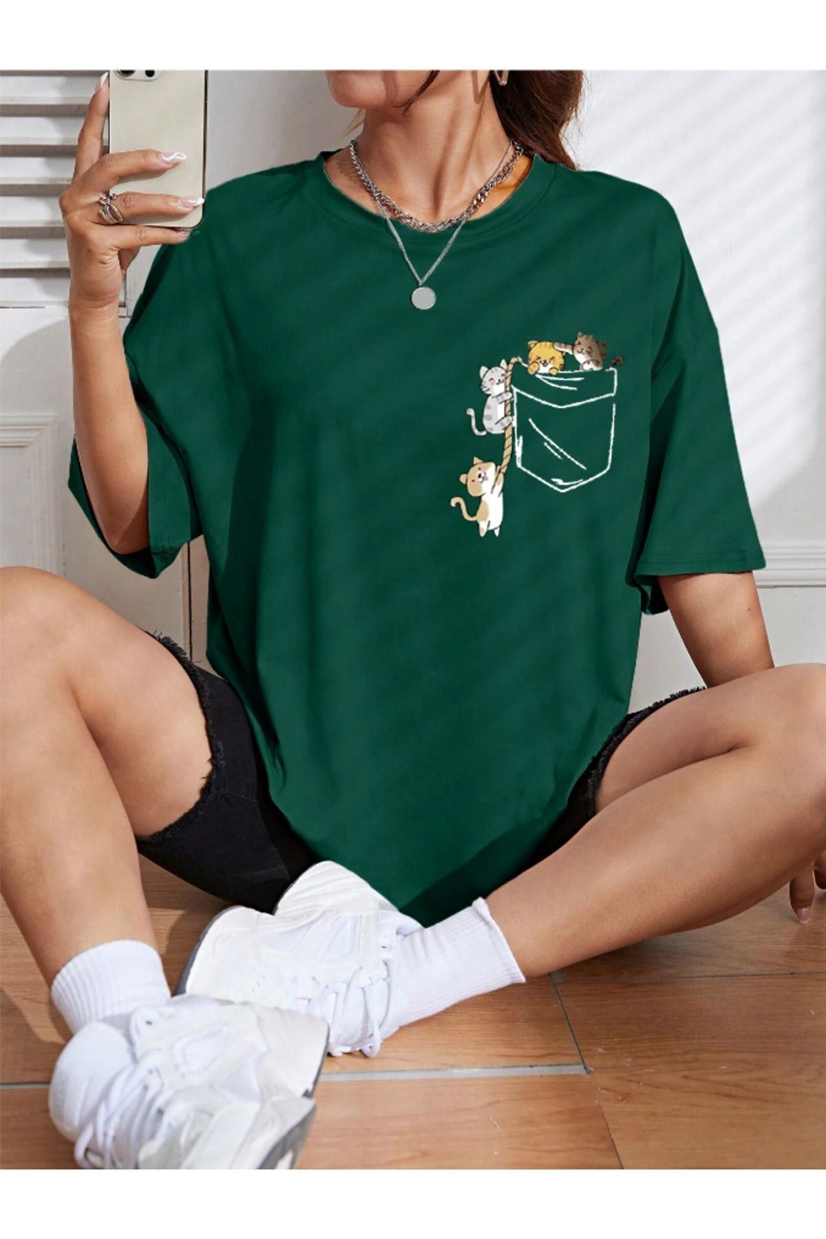 Unisex Kadın/Erkek CAT Renkli Özel Baskılı Oversize Bisiklet Yaka Süprem T-Shirt