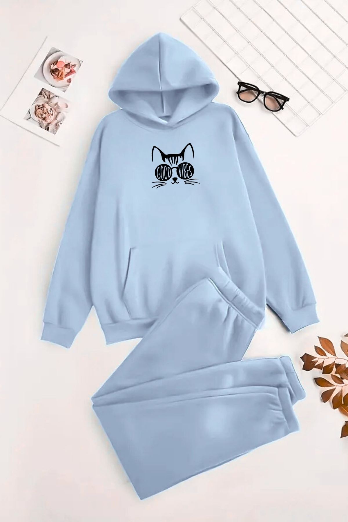 Unisex Kapüşonlu BebeMavi Eşofman Takımı GOOD VİBES CAT Baskılı- Kışlık Şardonlu Kumaş