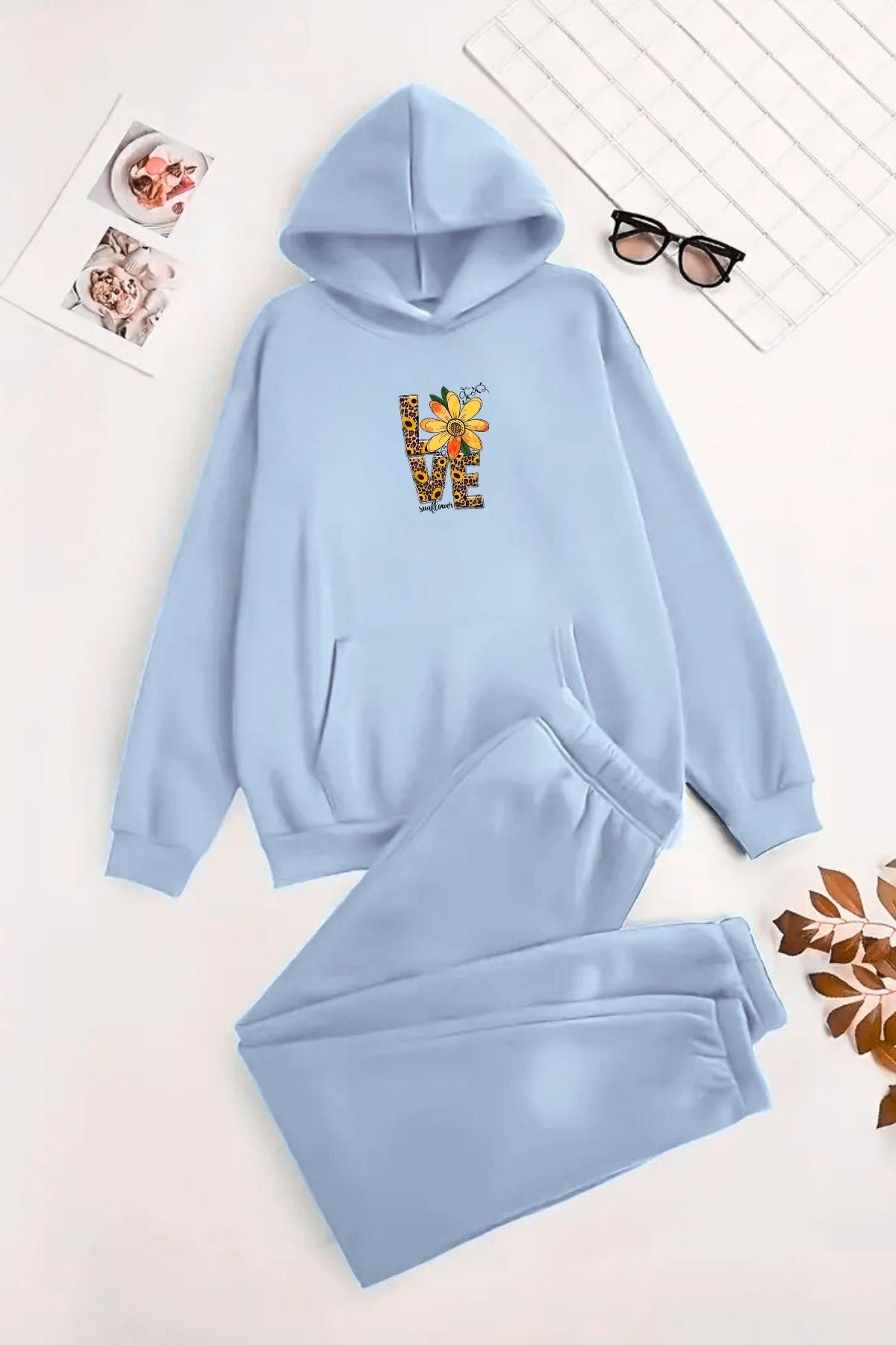 Unisex Kapüşonlu BebeMavi Eşofman Takımı LOVE ÇİÇEK Baskılı- Kışlık Şardonlu Kumaş