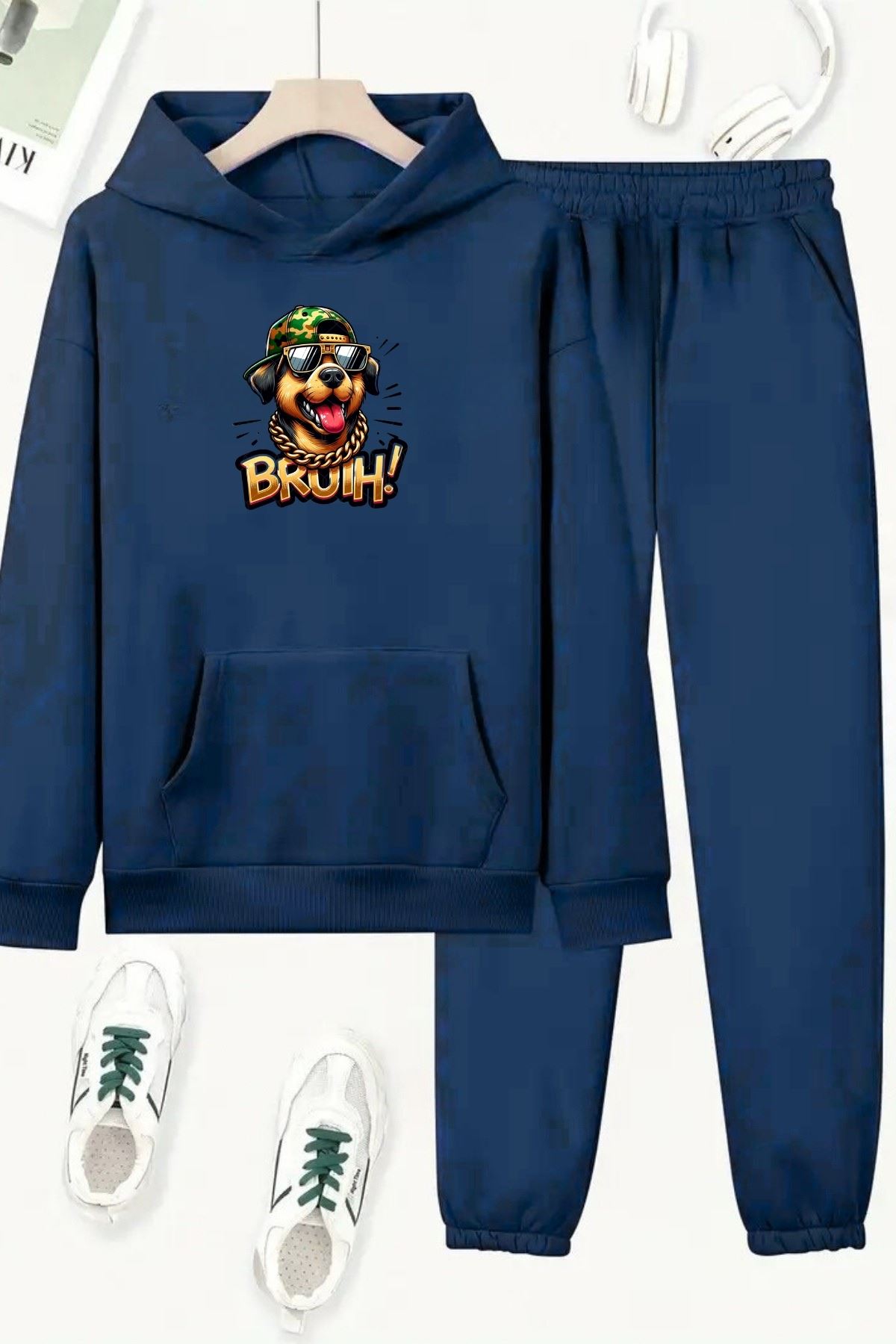 Unisex Lacivert BRUH Baskılı Eşofman Kapüşon- Kışlık Şardonlu Kumaş