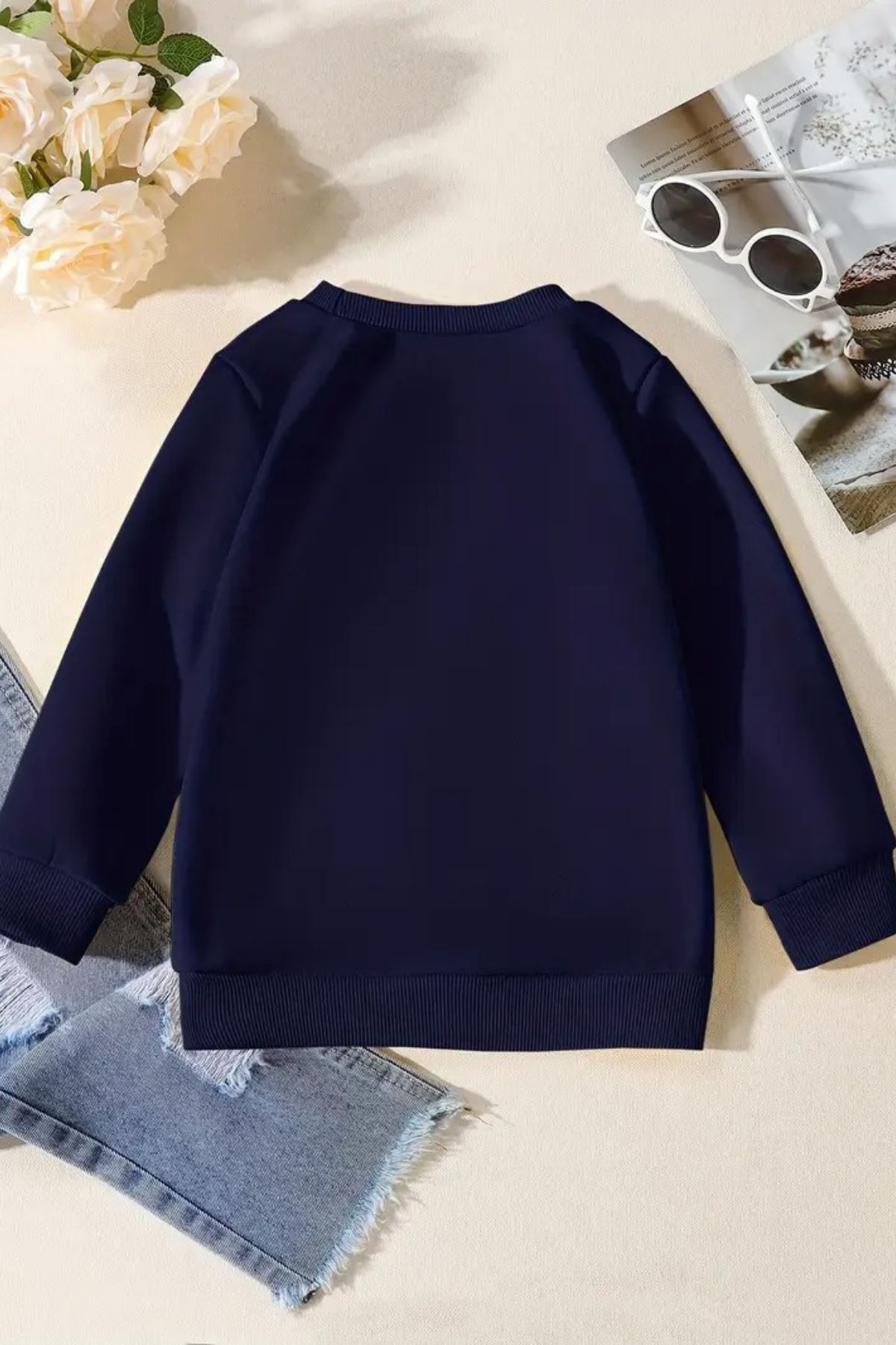Unisex Lacivert Cocuk Bisiklet Yaka Sweatshirt –Deniz Hayvanları,Baskılı Şardonlu Kalın Kumaş