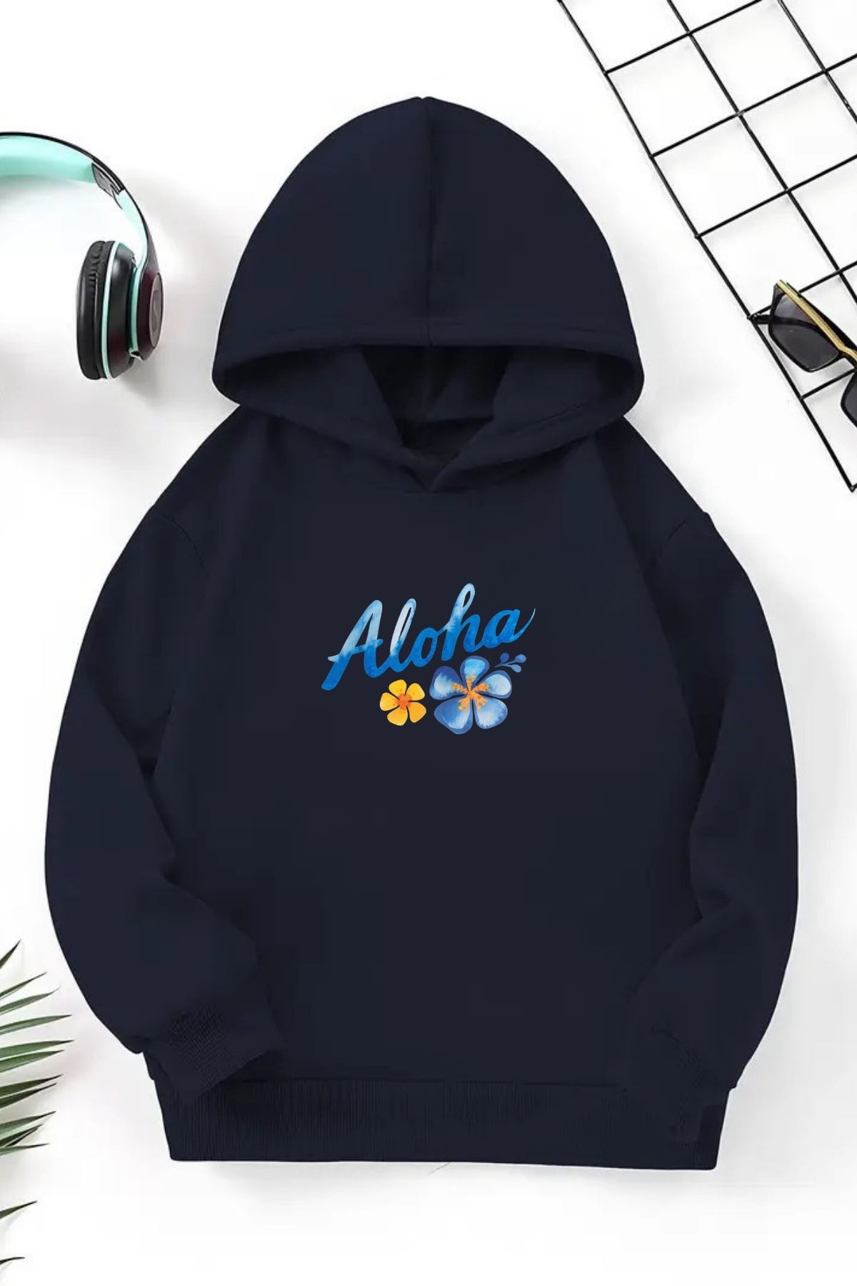 Unisex Lacivert Cocuk Kapüşonlu Sweatshirt –Aloha Çiçek,Baskılı Şardonlu Kalın Kumaş