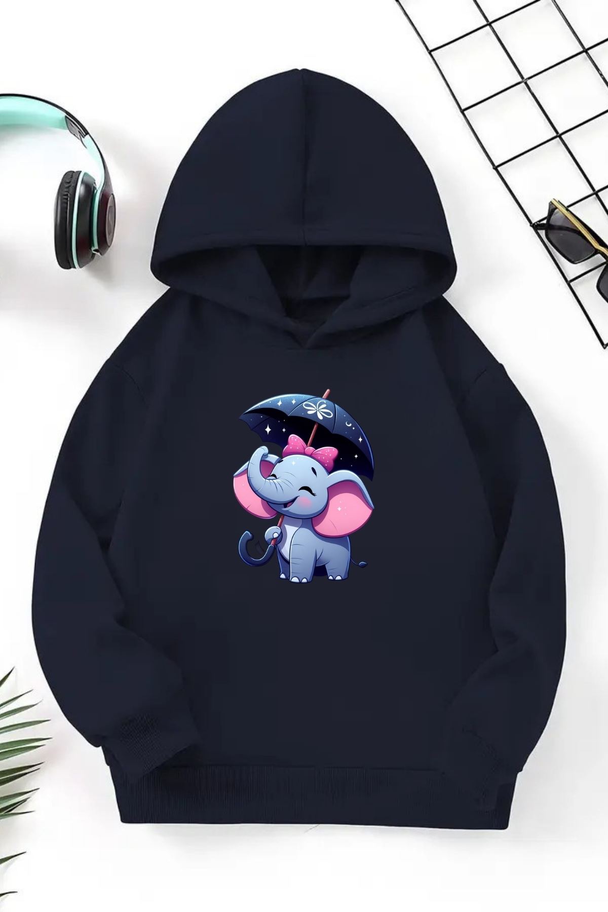 Unisex Lacivert Cocuk Kapüşonlu Sweatshirt –Fil,Baskılı Şardonlu Kalın Kumaş