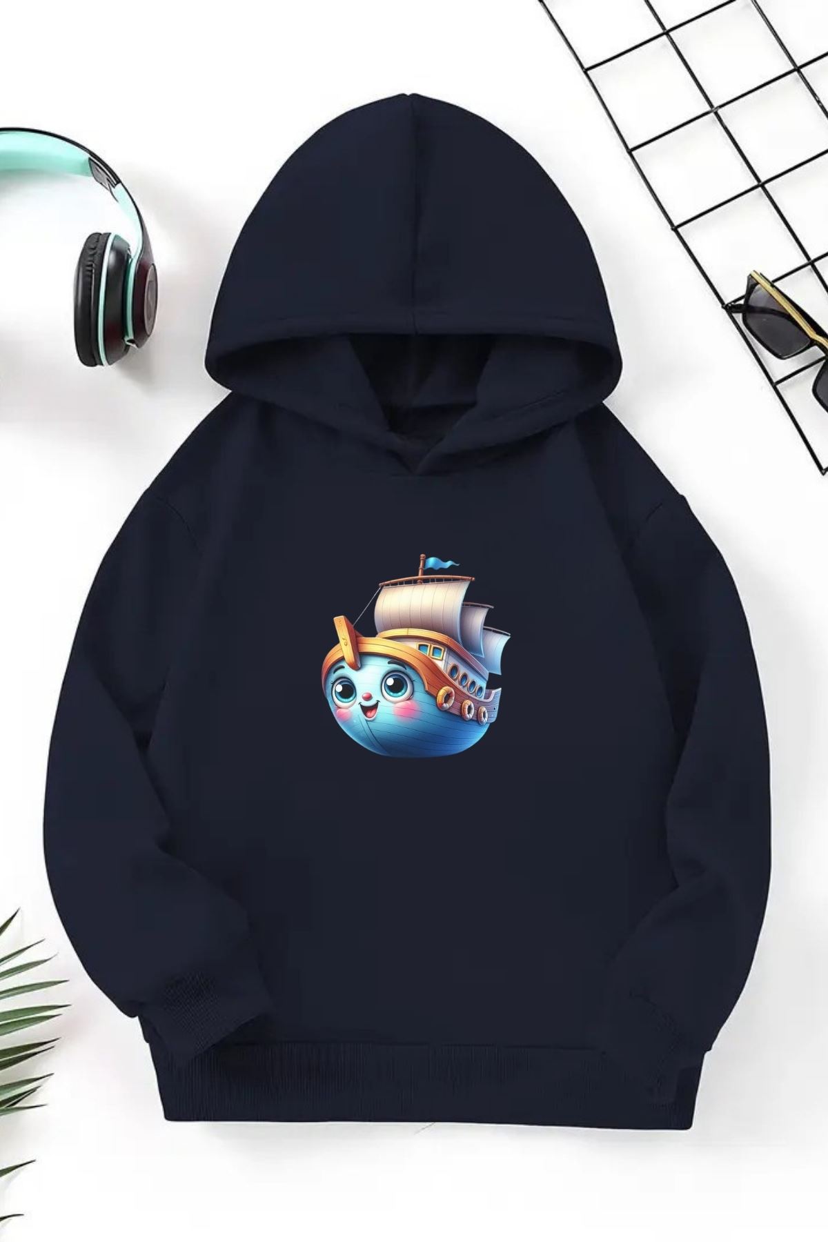 Unisex Lacivert Cocuk Kapüşonlu Sweatshirt –Gemi,Baskılı Şardonlu Kalın Kumaş
