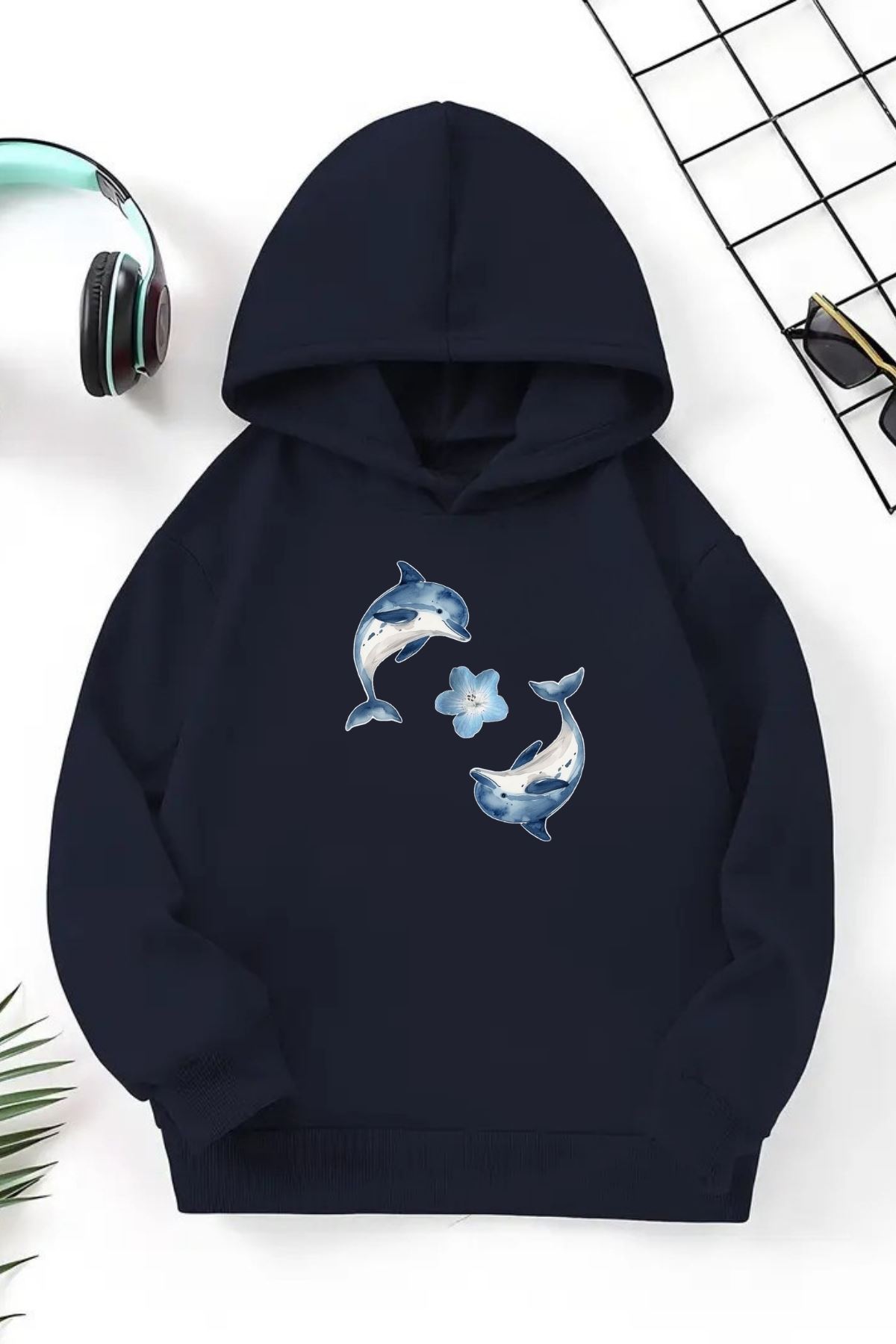 Unisex Lacivert Cocuk Kapüşonlu Sweatshirt –İkili Yunus,Baskılı Şardonlu Kalın Kumaş