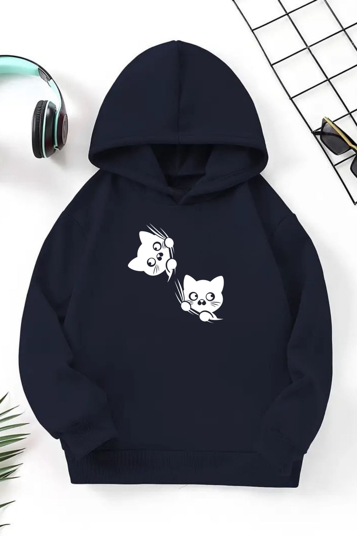 Unisex Lacivert Cocuk Kapüşonlu Sweatshirt –Meraklı Patiler,Baskılı Şardonlu Kalın Kumaş