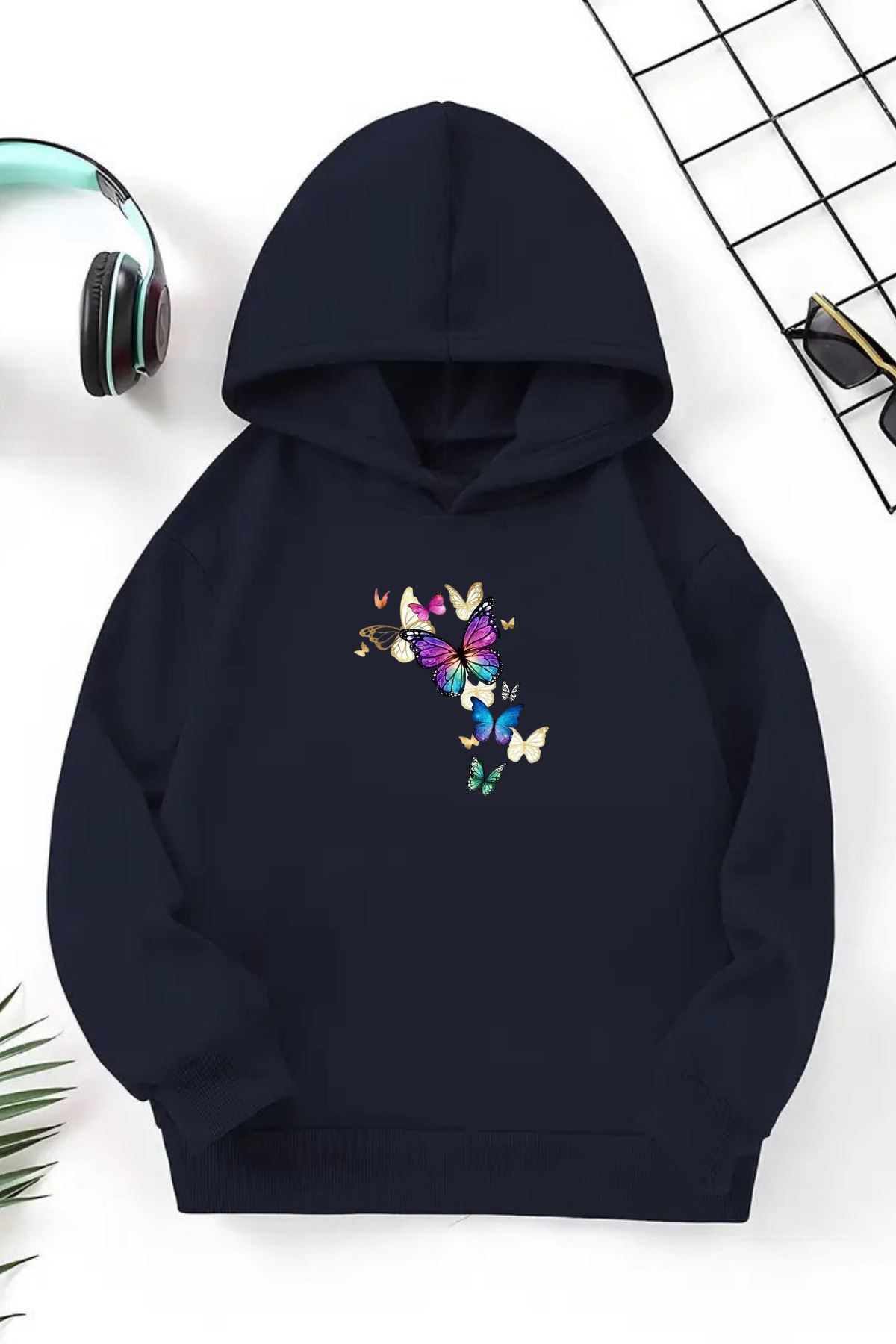 Unisex Lacivert Cocuk Kapüşonlu Sweatshirt –Renkli Kelebek,Baskılı Şardonlu Kalın Kumaş