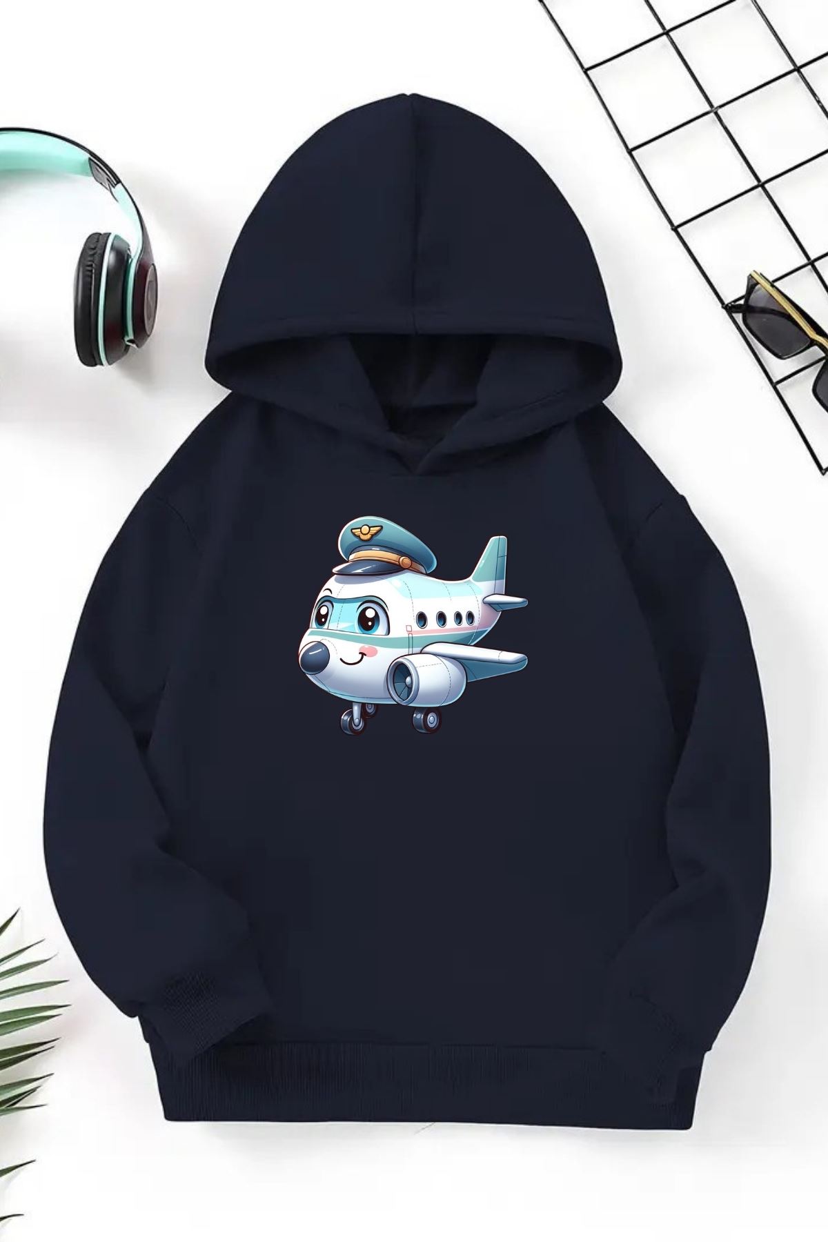 Unisex Lacivert Cocuk Kapüşonlu Sweatshirt –Uçak ,Baskılı Şardonlu Kalın Kumaş